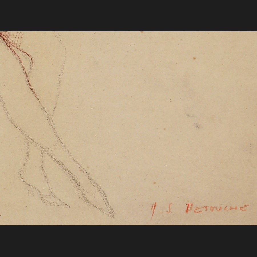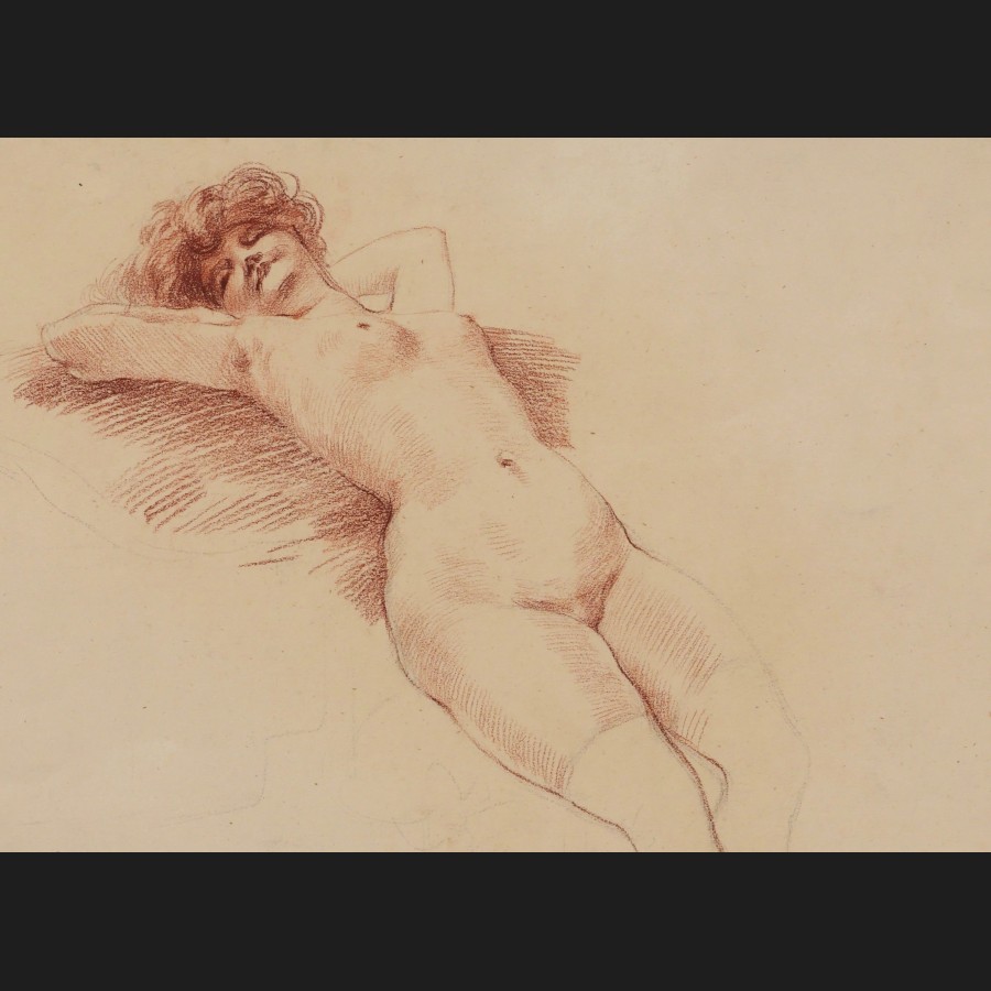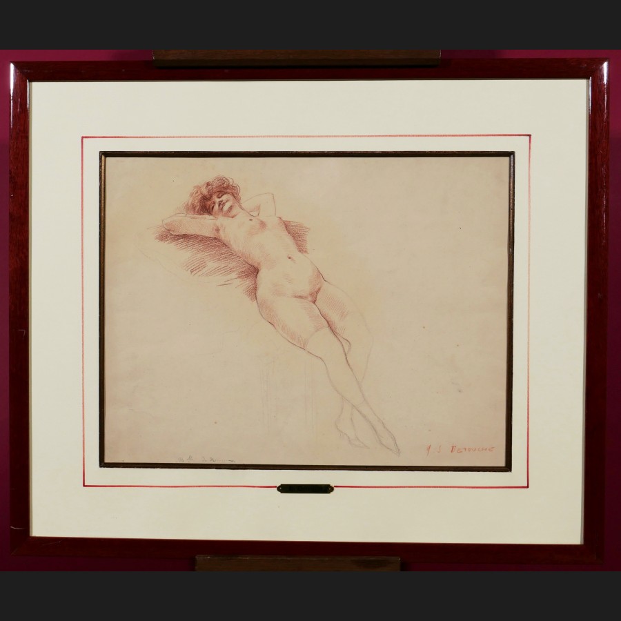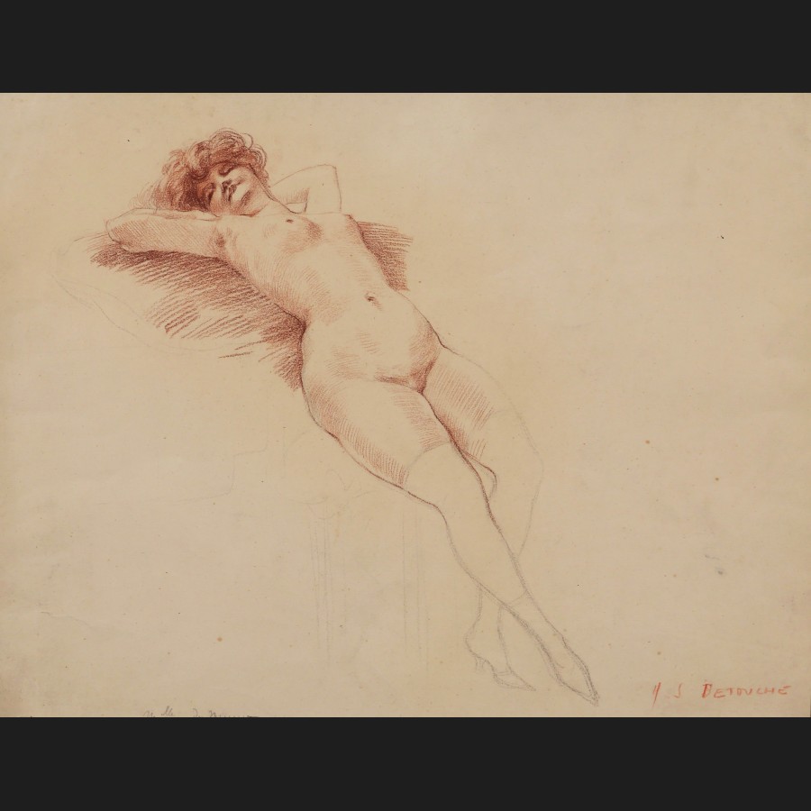 Henri Julien DETOUCHE (1854-1913)Nu féminin allongéCraie noire et sanguine sur papierSigné en bas à droite H.J. DETOUCHE36 x 48 cm