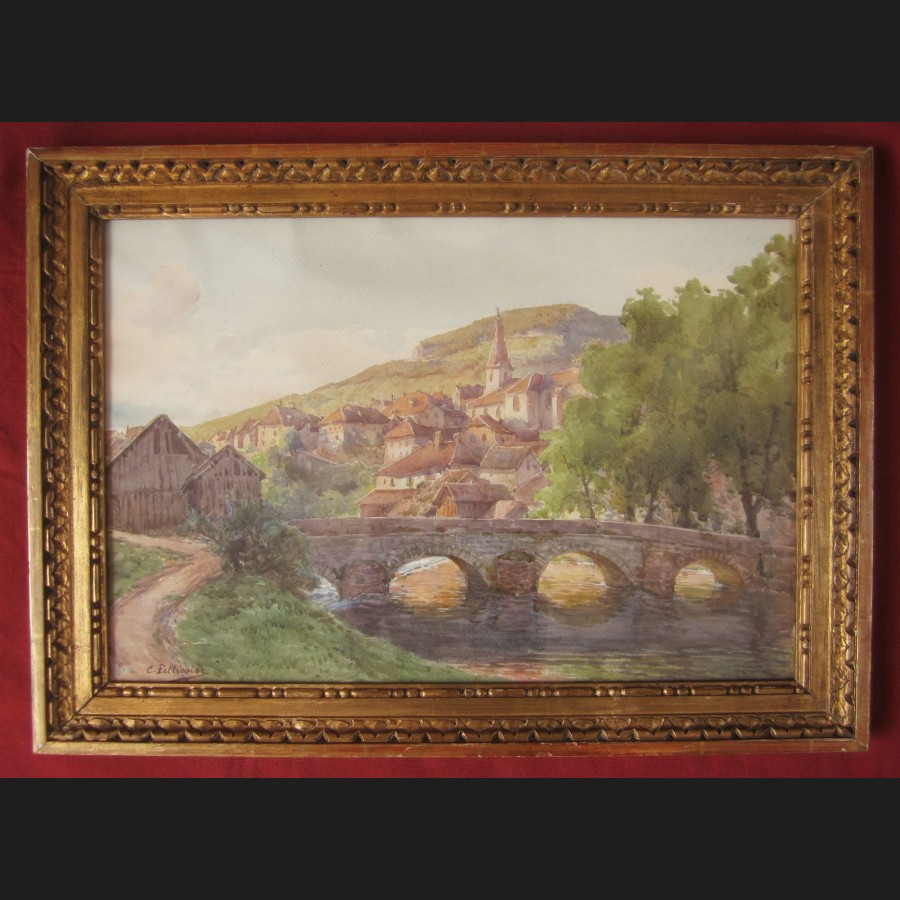 Cécile PELLISSIER, Le vieux pont sur la Loue à Lods dans le Doubs, aquarelle