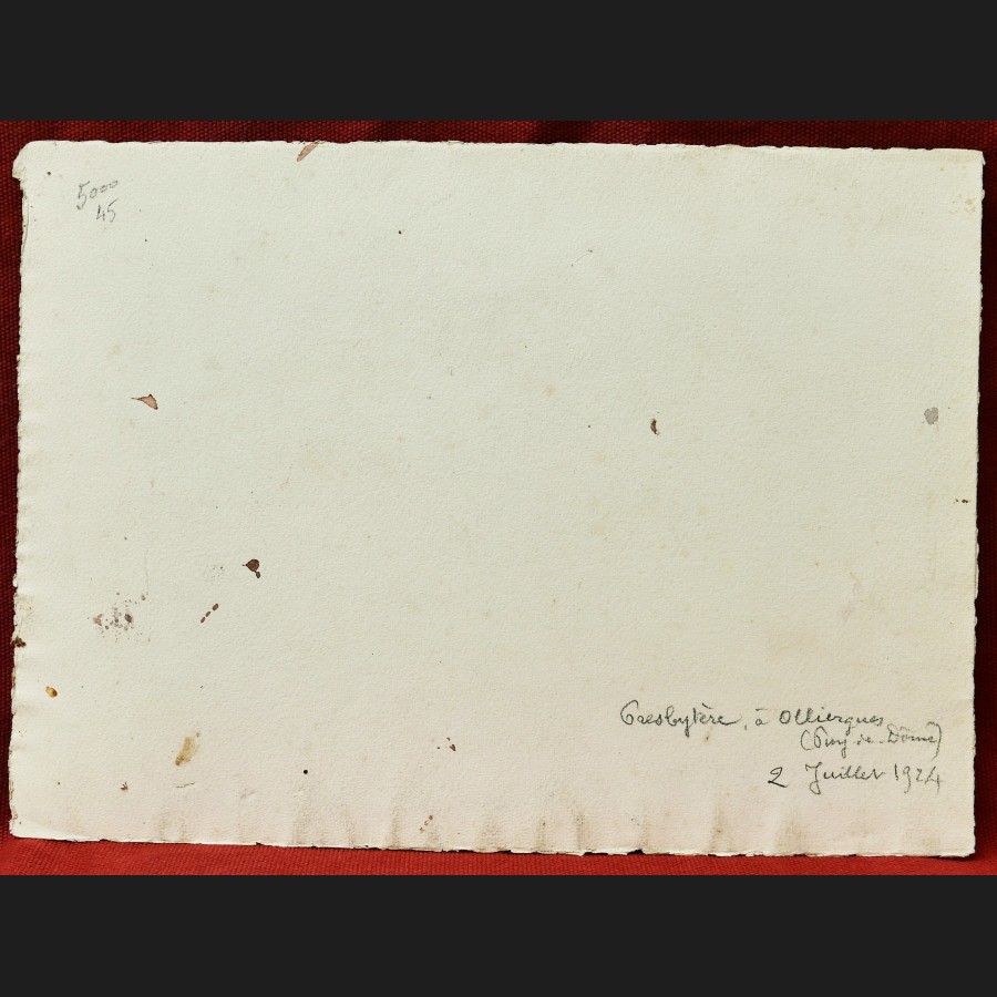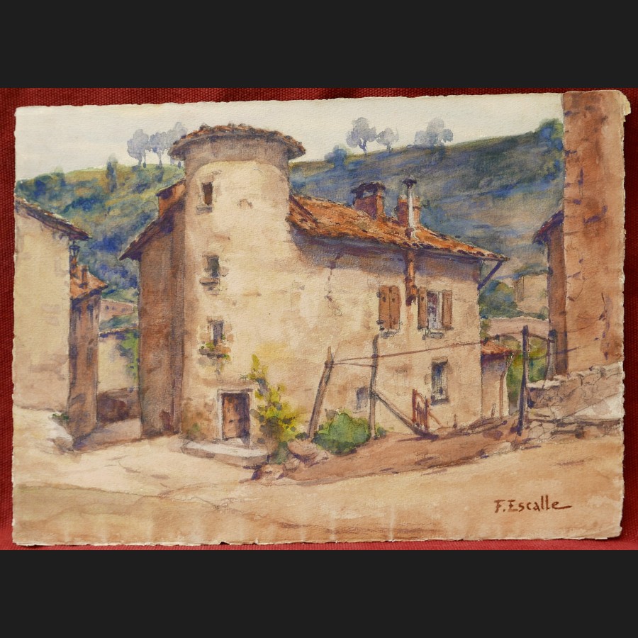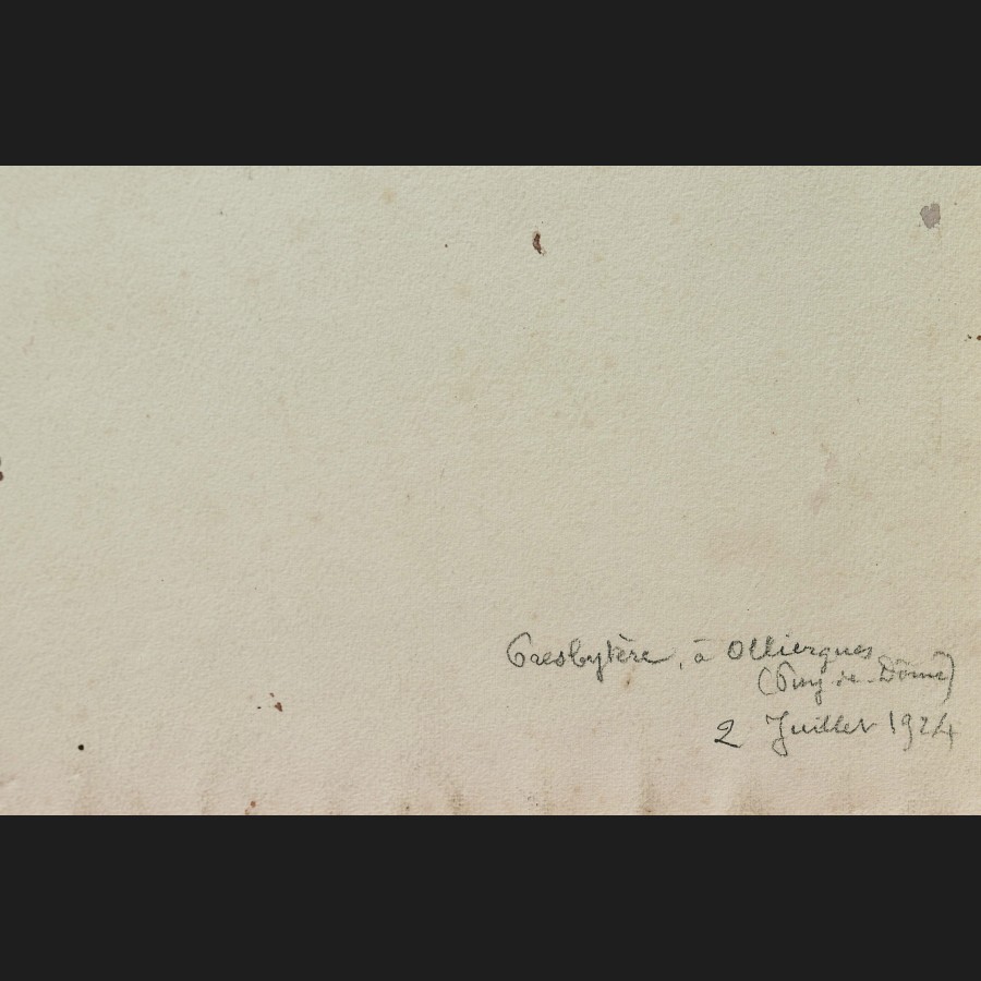 Signé en bas à droite F Escalle, situé et daté au dos Presbytère à Olliergues (Puy-de-Dôme) / 2 juillet 1924