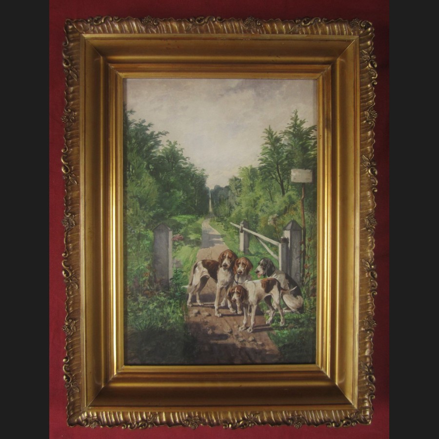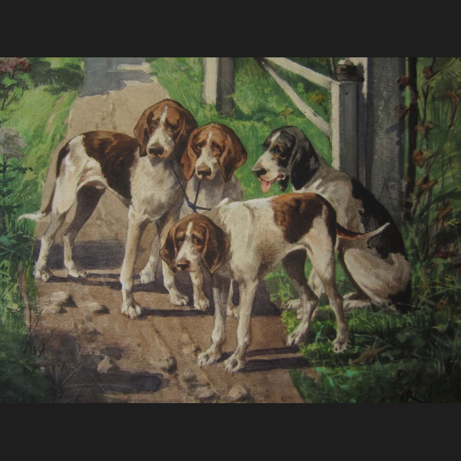 Hippolyte Jean Adam GIDE, Chiens de chasse au repos sur un chemin, aquarelle