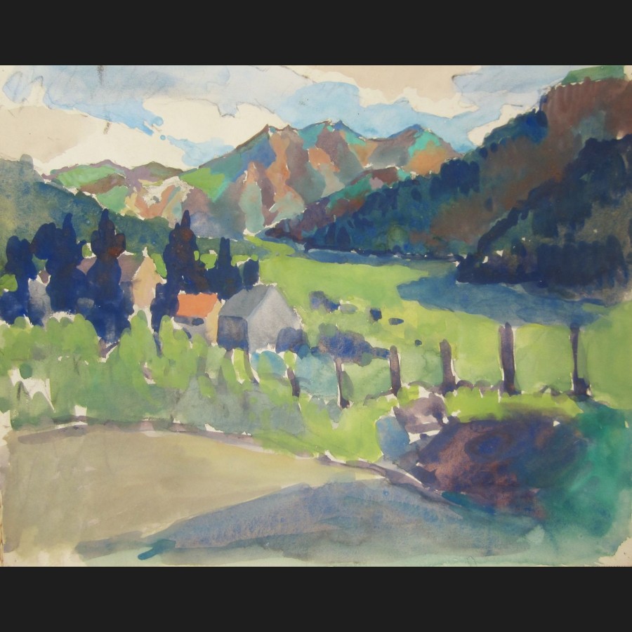 Marc ALLOUETEAU, Route et maisons dans un paysage montagneux, aquarelle