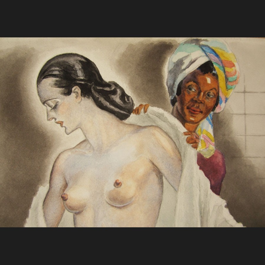 Marc ALLOUETEAU, Femme nue sortant du bain, aquarelle
