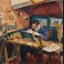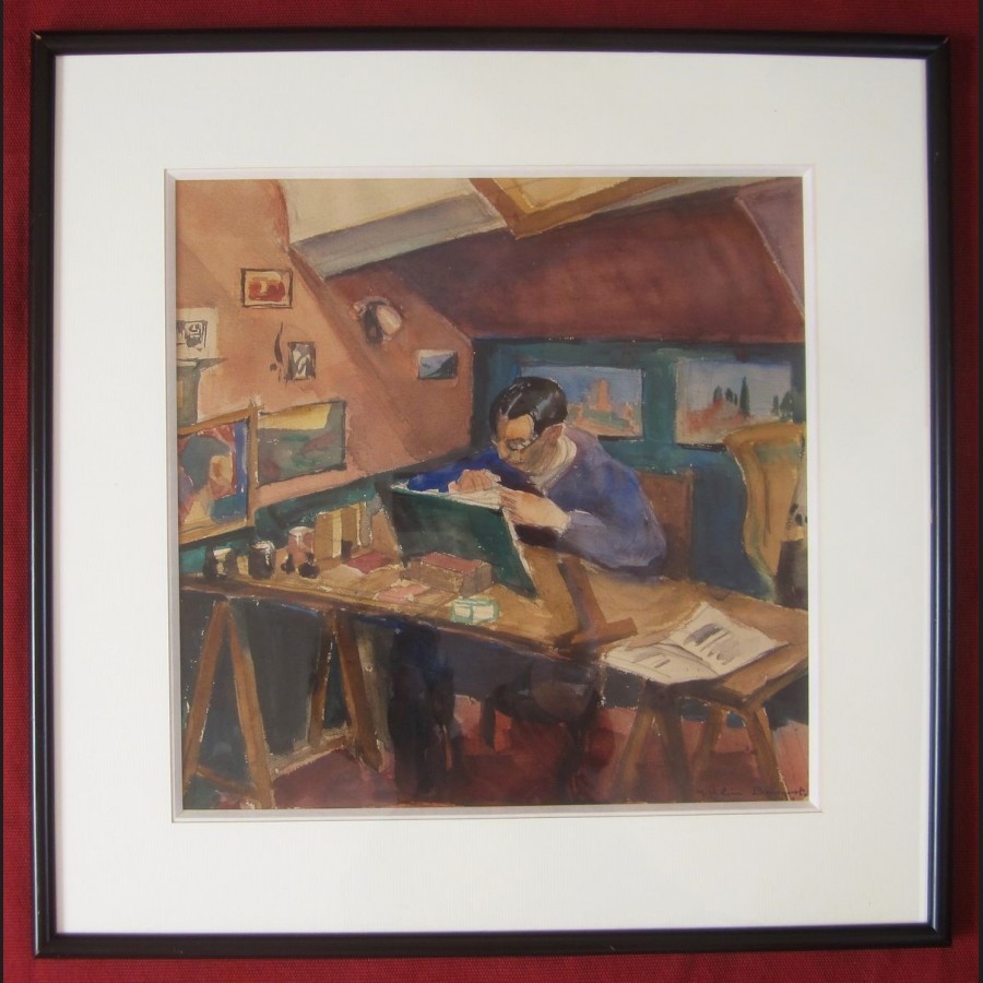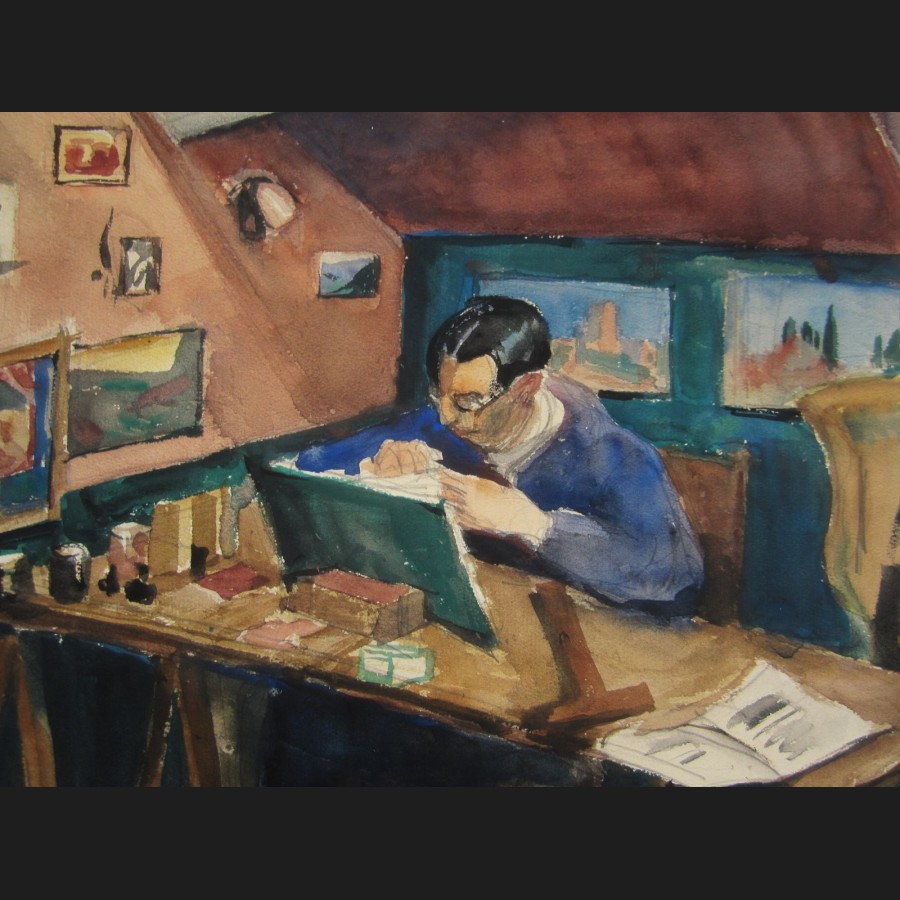 Micheline BOUSQUET-DECARIS, Albert Decaris dans son atelier, aquarelle