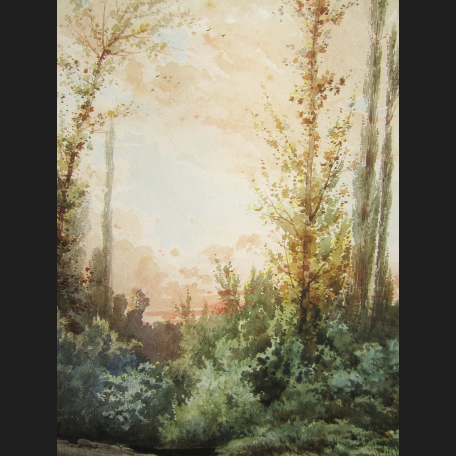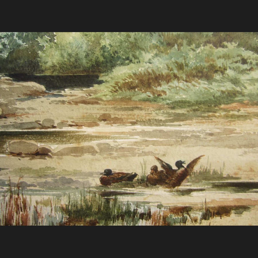 Auguste ALLONGÉ, Canards sur la rivière à la tombée du jour, aquarelle