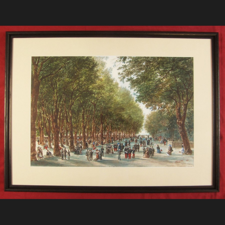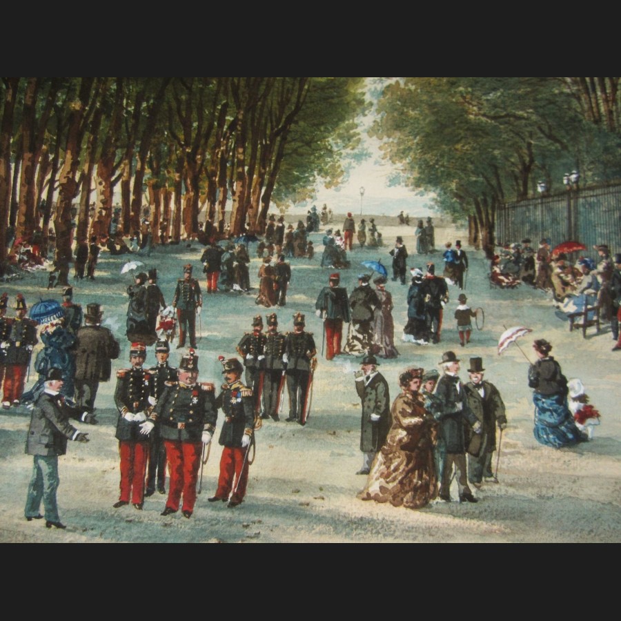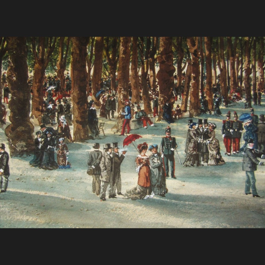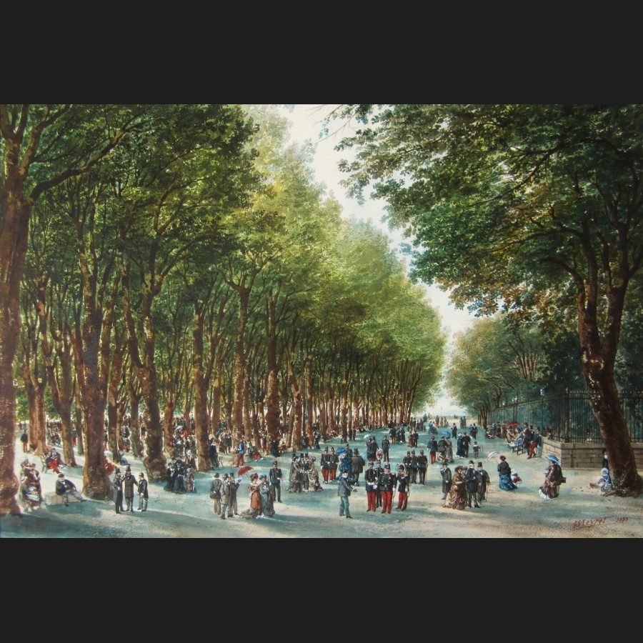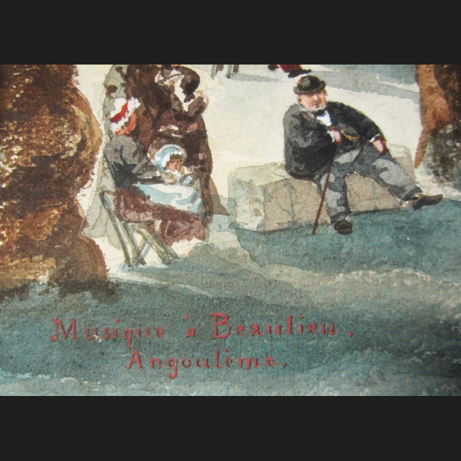 Titré et situé en bas à gauche MUSIQUE À BEAULIEU / ANGOULÊME, signé et daté en bas à droite Meyret 1883