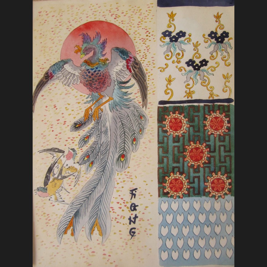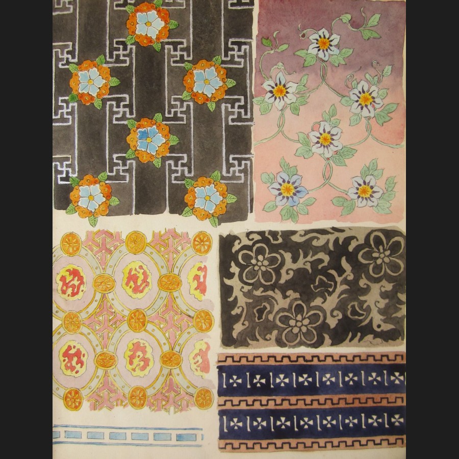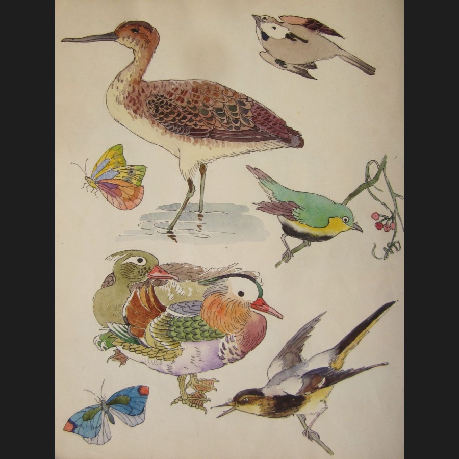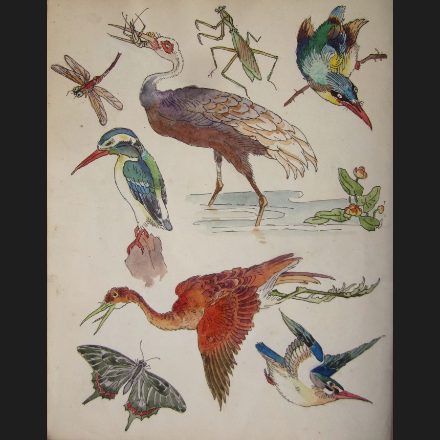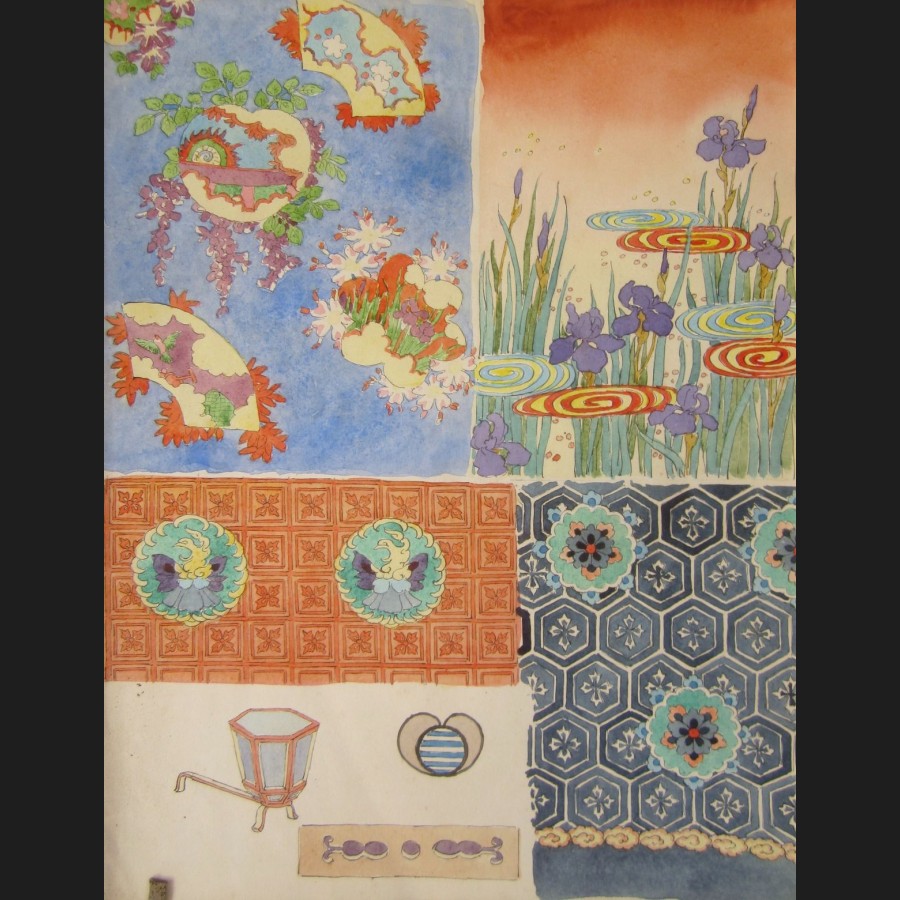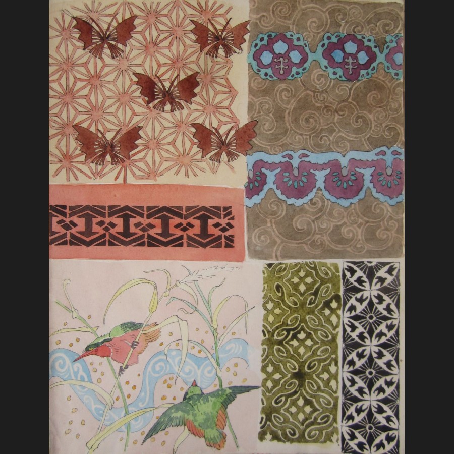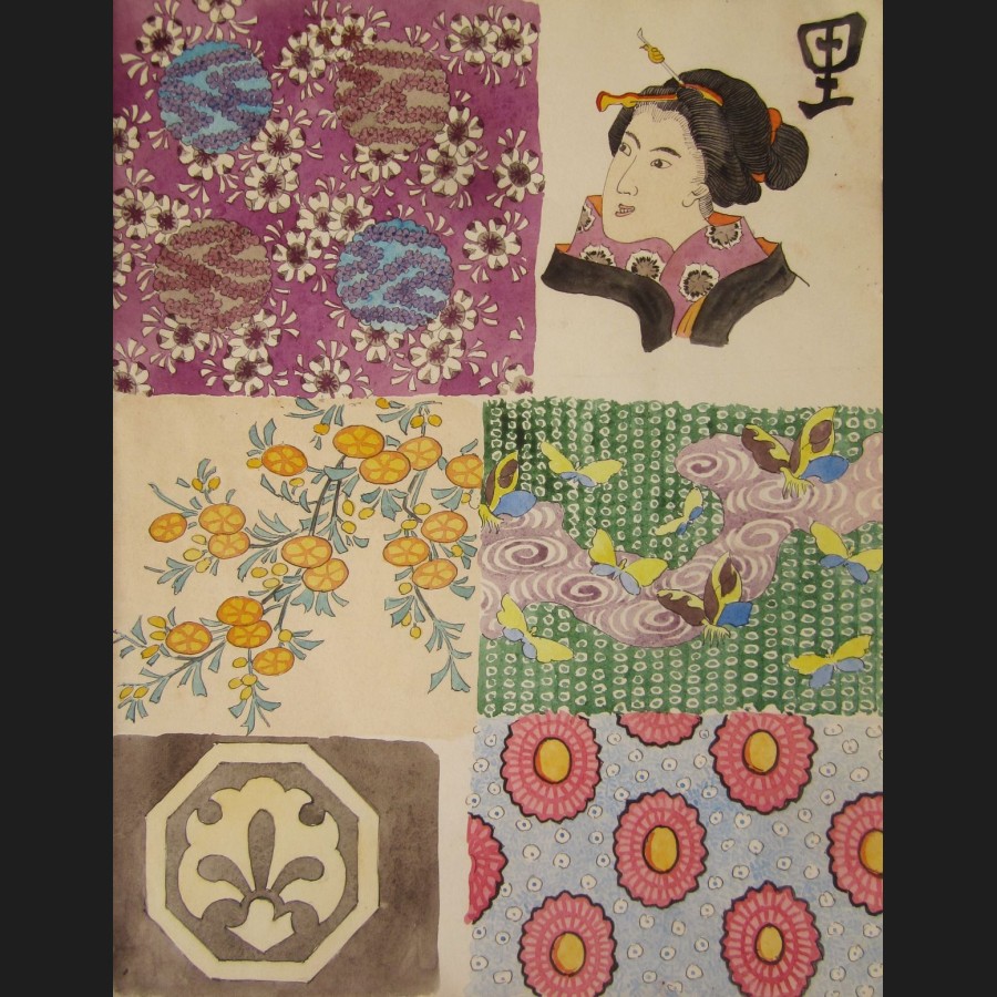 Carnet de dessins comprenant 12 pages d'aquarelles : motifs décoratifs, femme japonaise, insectes et volatiles