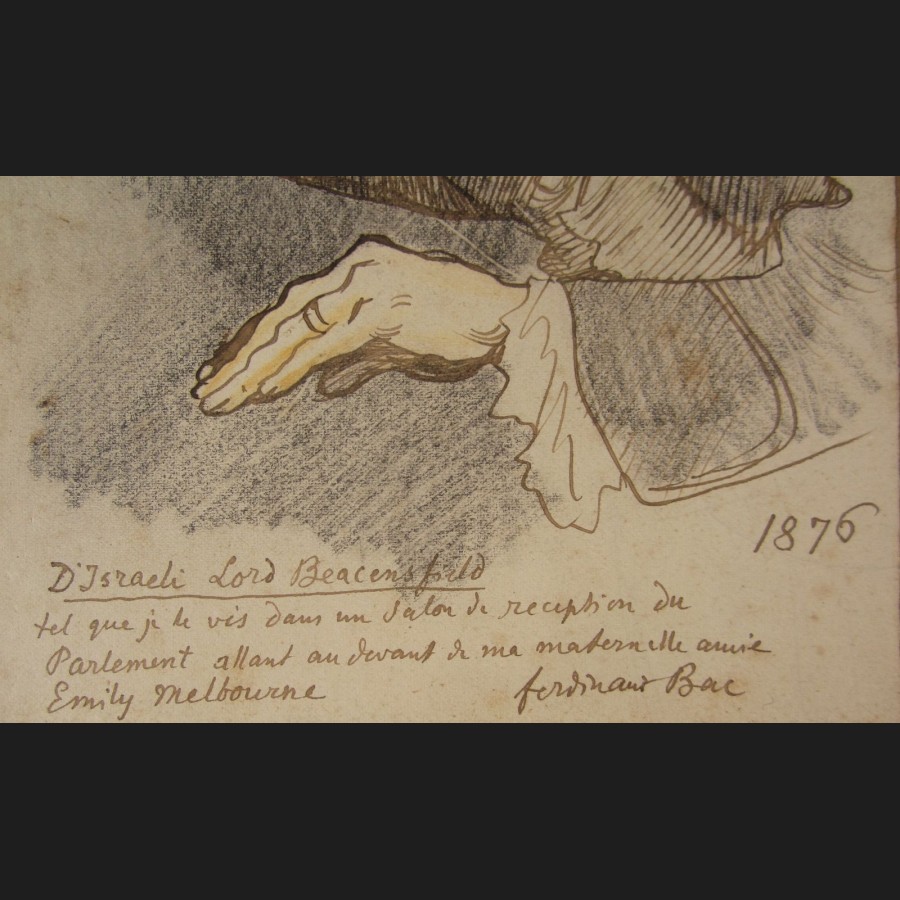 Légendé en bas à gauche D'Israeli Lord Beacensfield (sic) / tel que je le vis dans un salon de réception du Parlement allant au devant de ma maternelle amie Emily Melbourne