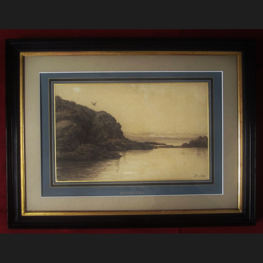Cadre en bois noirci et passe en papier bleuté marqué DAUBIGNY en lettres dorées d'origine