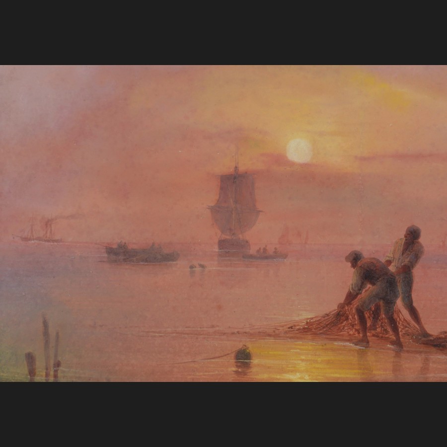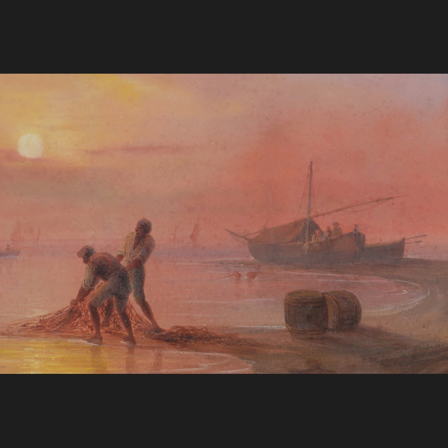 Giuseppe DELPINO, Côte napolitaine animée au soleil couchant, aquarelle et gouache