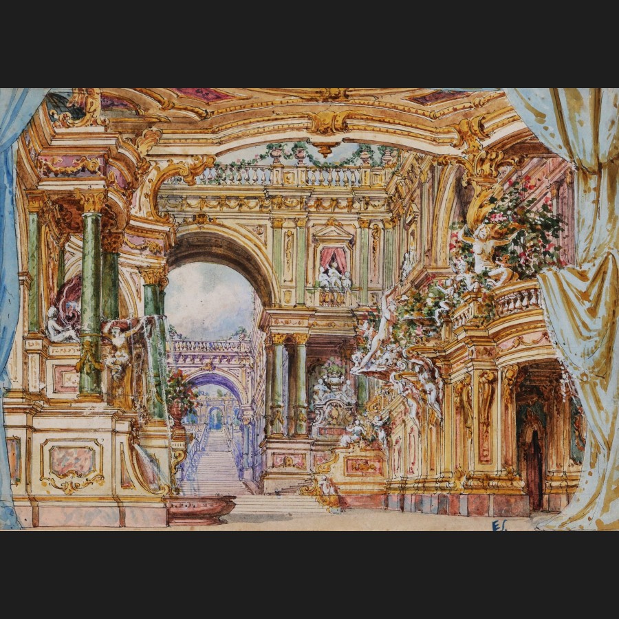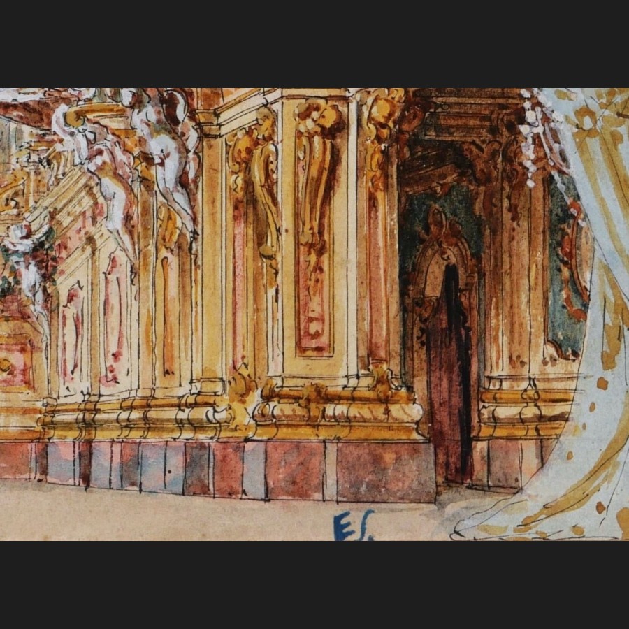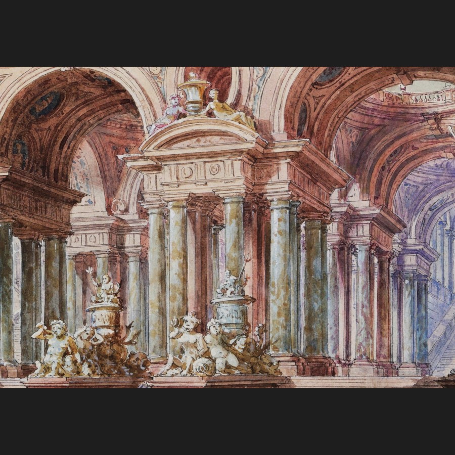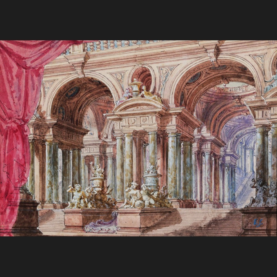 5) Rideaux bleus, intérieur de palais, fontaines et caryatides (17 x 24 cm)
