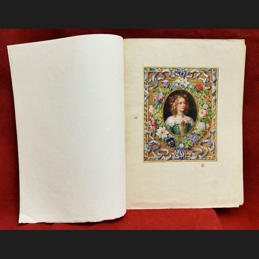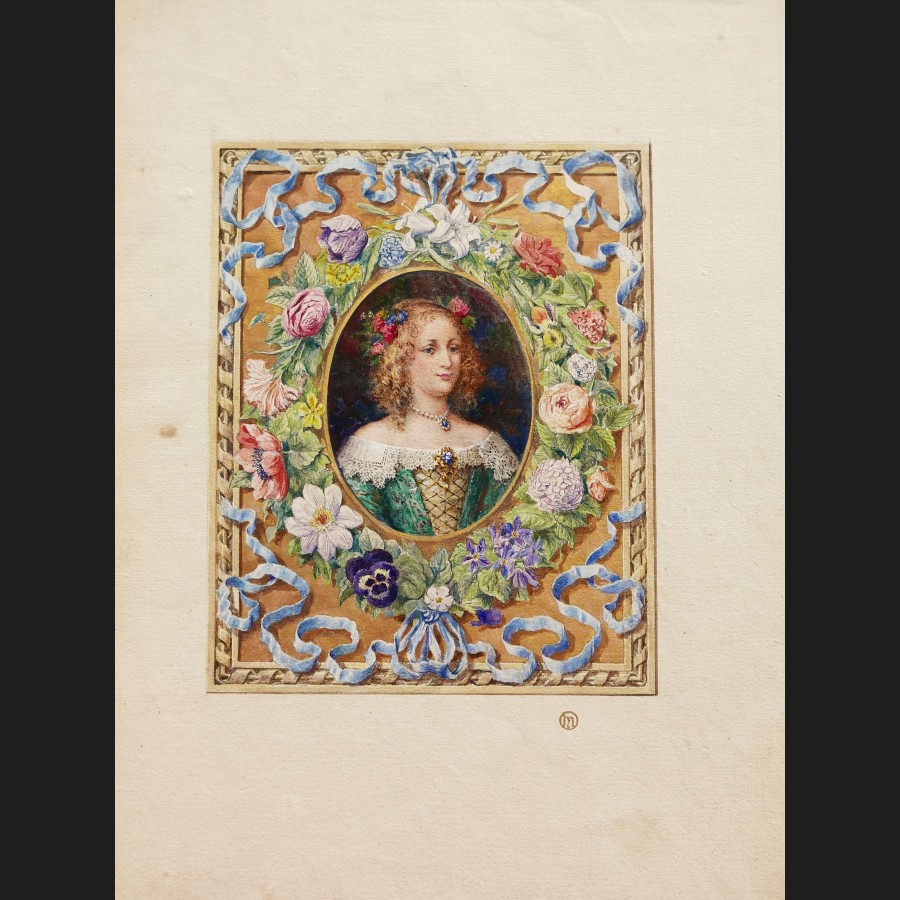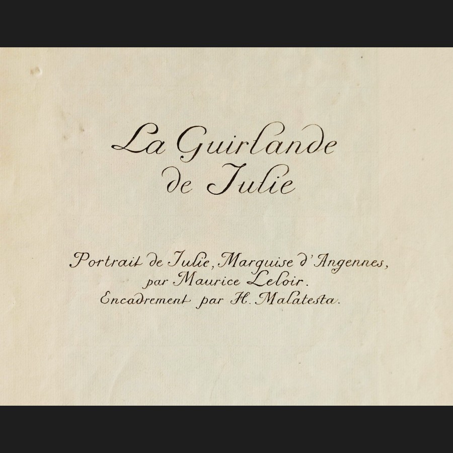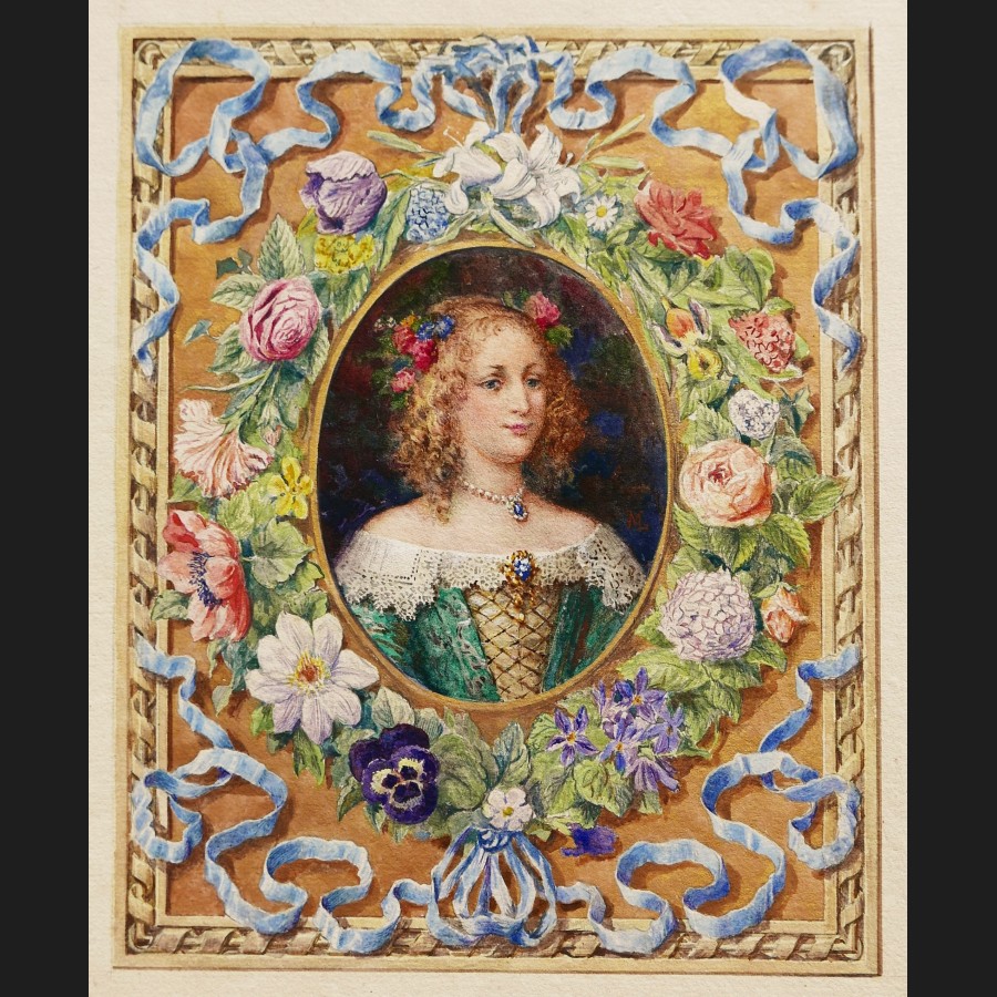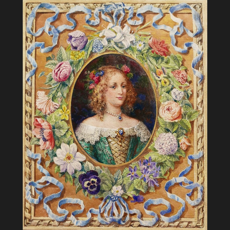 Plume, pinceau, encre brune, aquarelle et rehauts d'or sur papier, avec une page de titre inscrite Portrait de Julie, Marquise d'Angennes, par Maurice Leloir. Encadrement par H. Malatesta.