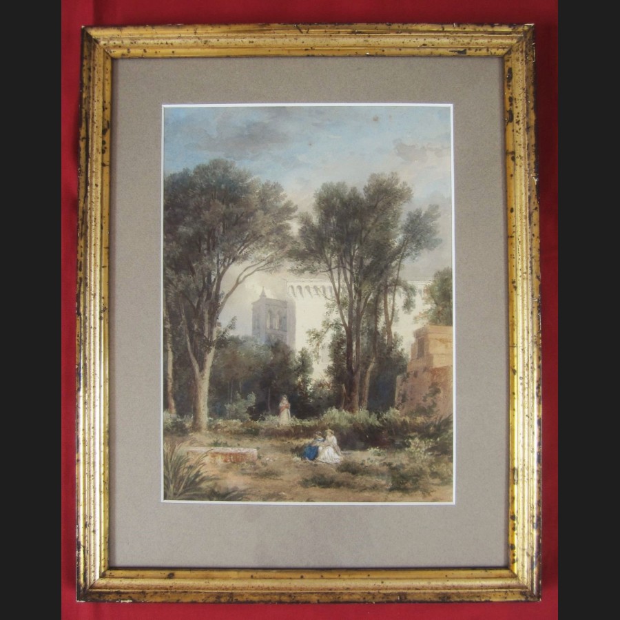 École FRANÇAISE du XIXème siècle, Femmes dans un paysage italien romantique, aquarelle