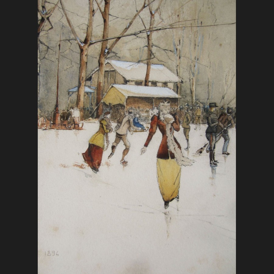 François de FOSSA, Patineurs au Bois de Vincennes, aquarelle