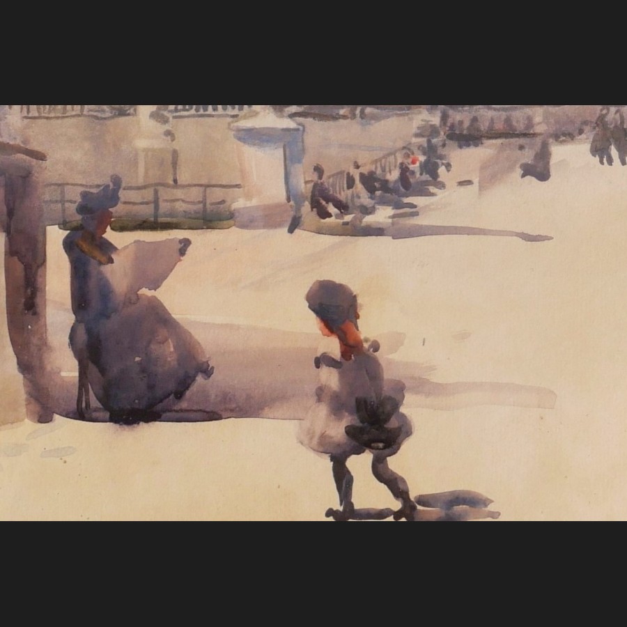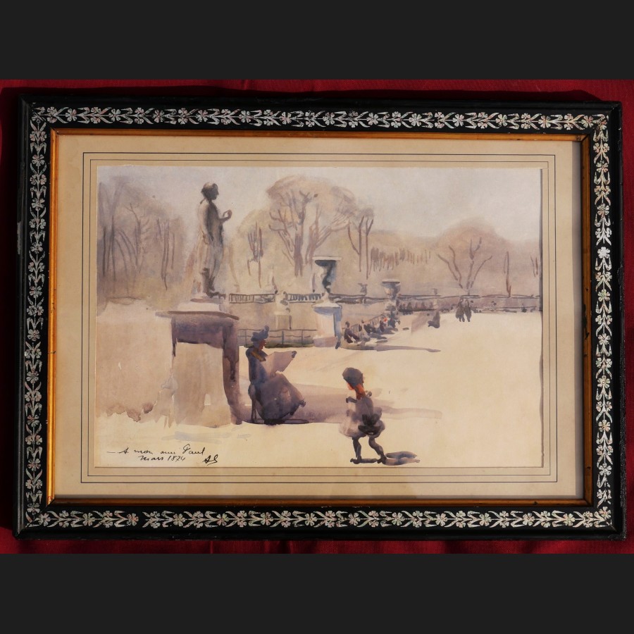 École FRANÇAISE 1874, Vue animée au Jardin du Luxembourg, aquarelle