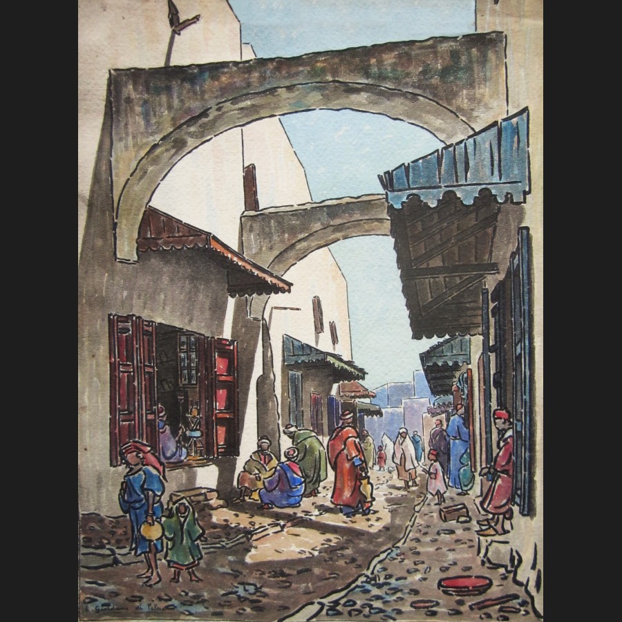 Léon Jean GIORDANO di PALMA, Rue animée avec une mère et sa fille au Maroc, aquarelle