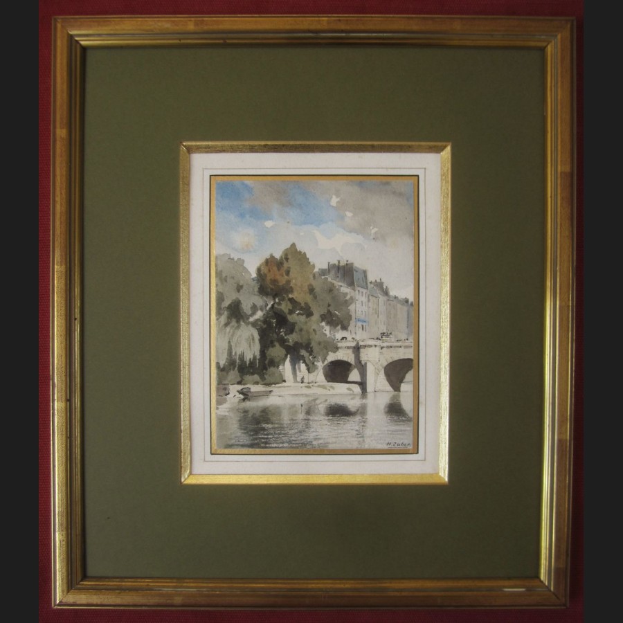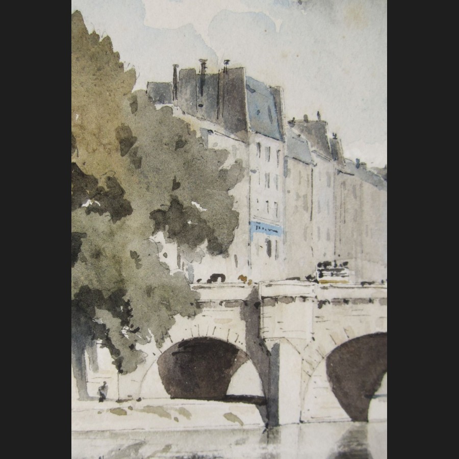Henri ZUBER (Rixheim, 1844 – Paris, 1909)Le Pont-Neuf à ParisAquarelle sur papierSigné en bas à droite H. Zuber15,5 x 11,5 cmCadre en bois doré