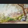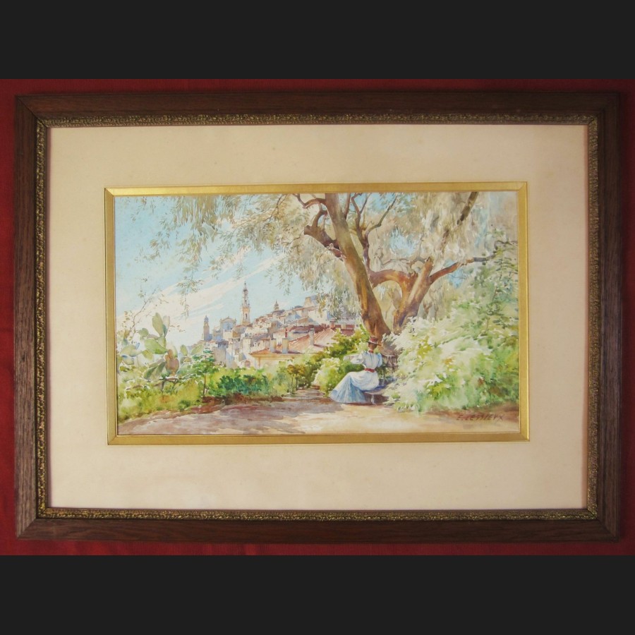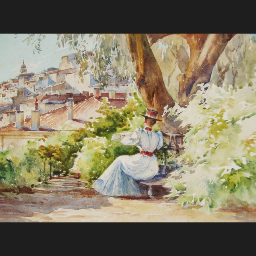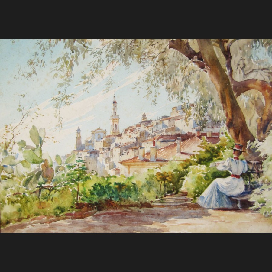 Louis Ernest LESSIEUX, Élégante en robe sur les hauteurs de Menton, aquarelle