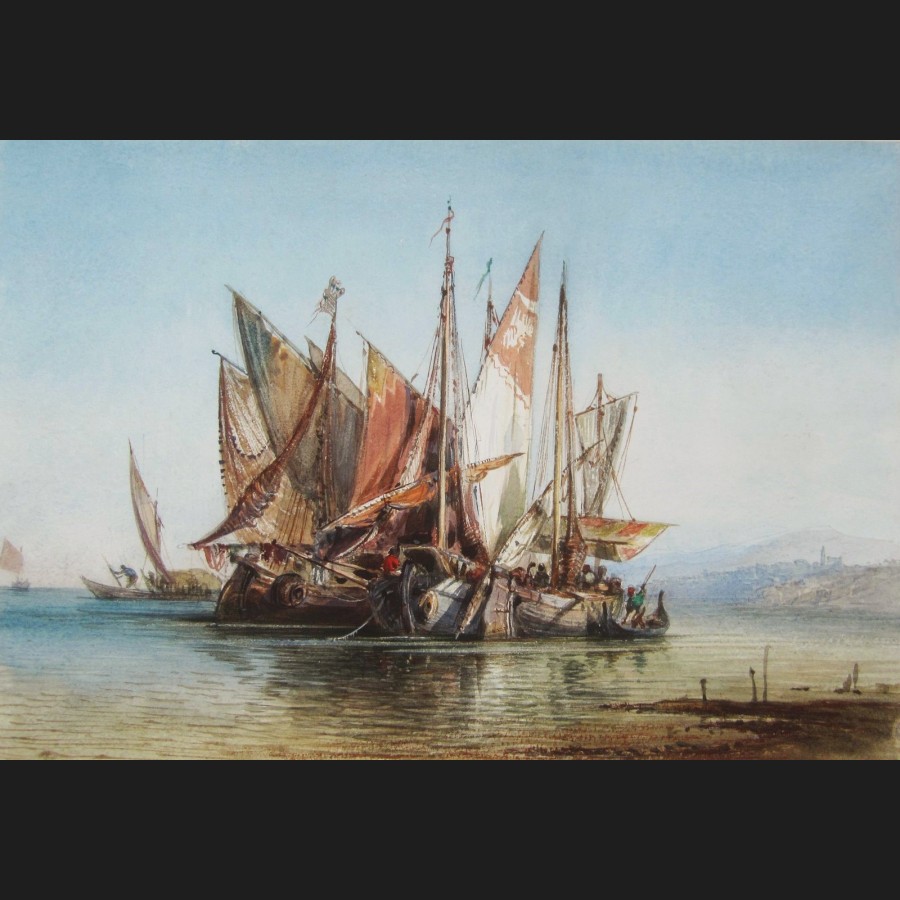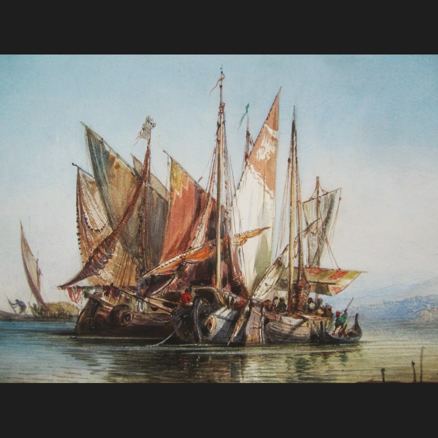 Attribué à William WYLD, Bateaux et marins sur la lagune de Venise, aquarelle