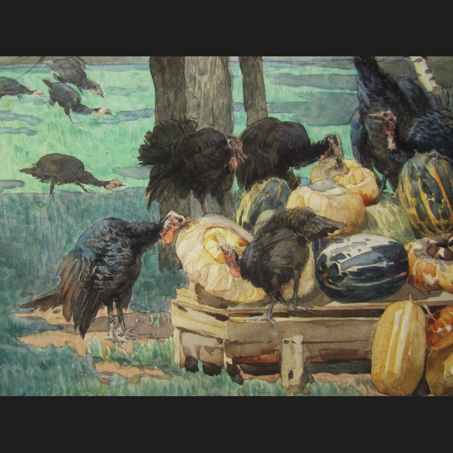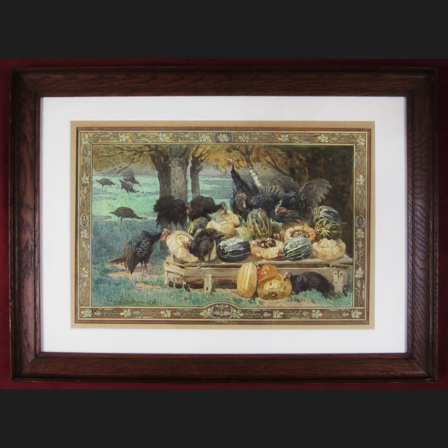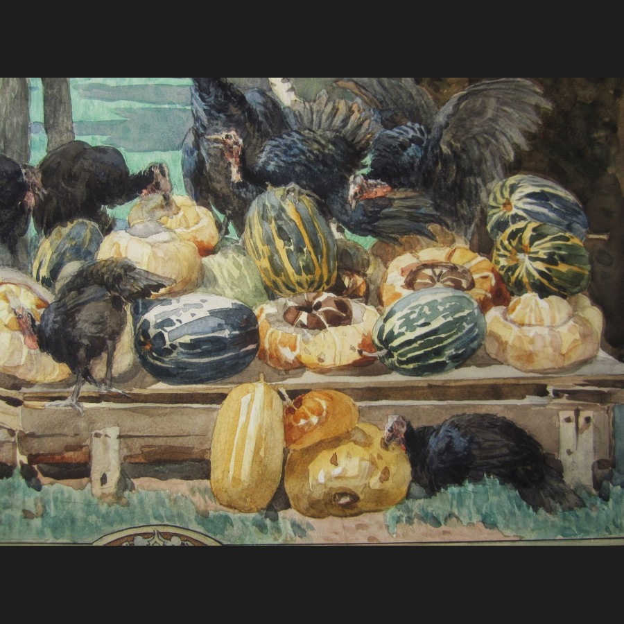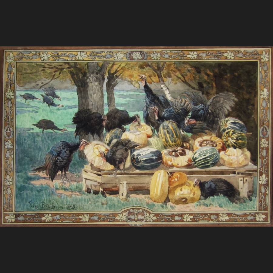 Félix BRARD, Dindons et cucurbitacées (Allégorie de la découverte de l'Amérique), aquarelle