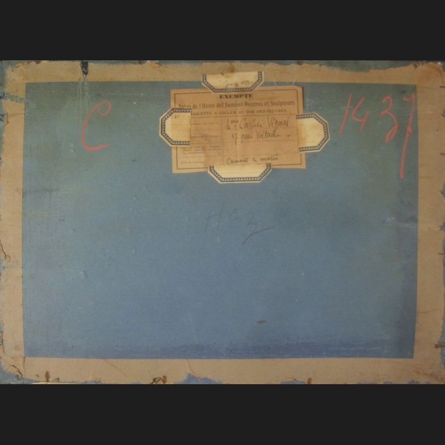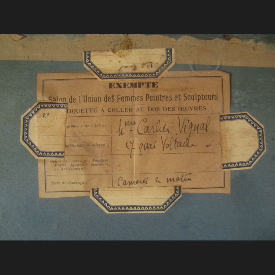Signé en bas à gauche Carlier-Vignal, porte une étiquette au dos du Salon de l'Union des Femmes Peintres et Sculpteurs contresignée et titrée Mme Carlier-Vignal / 17 quai Voltaire / Camaret le matin