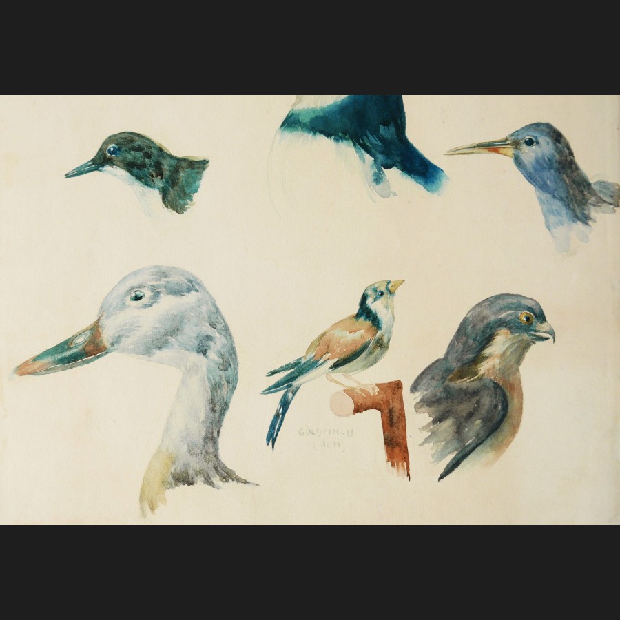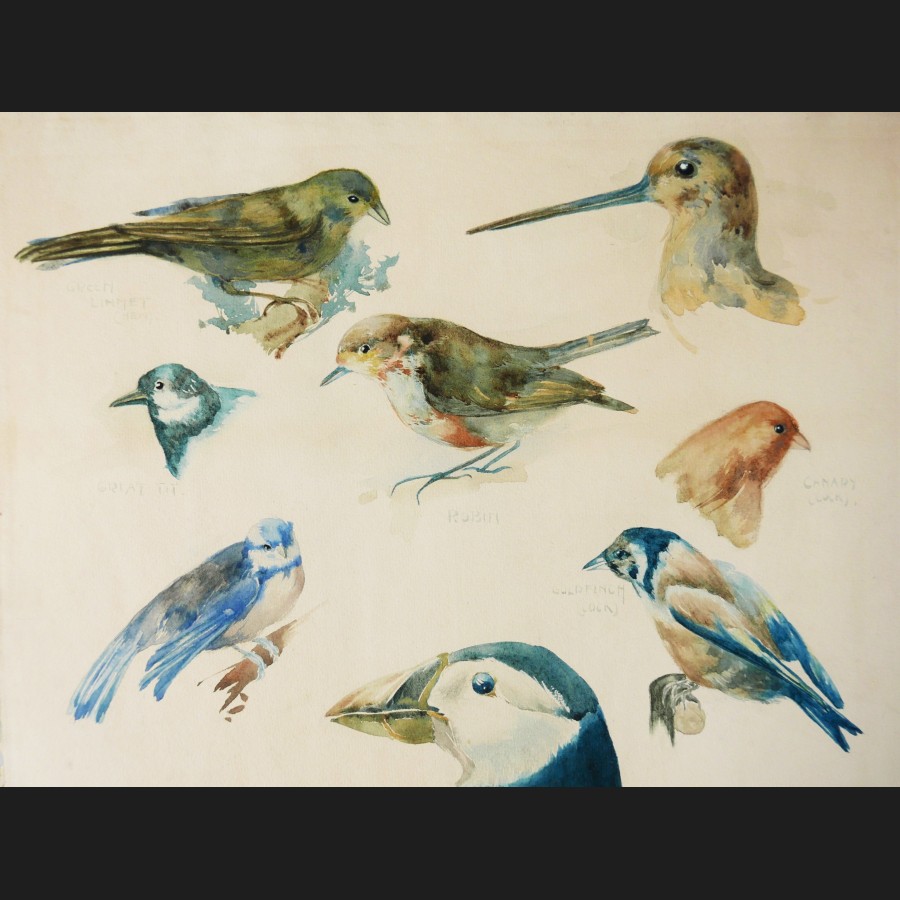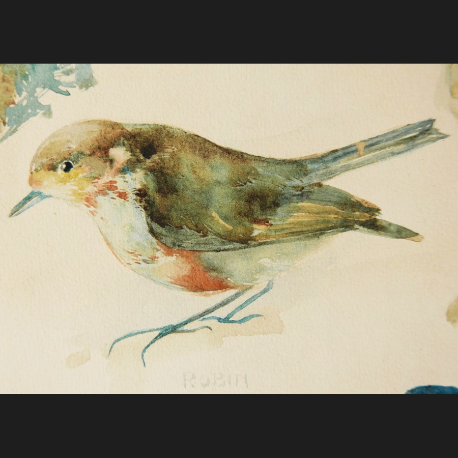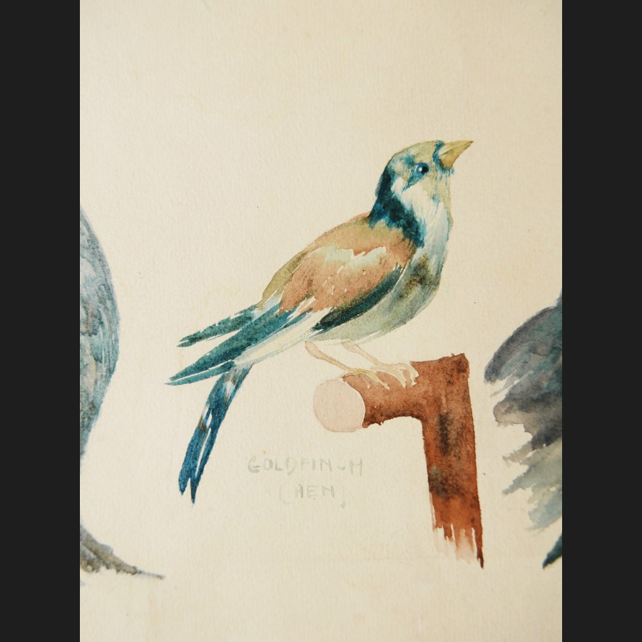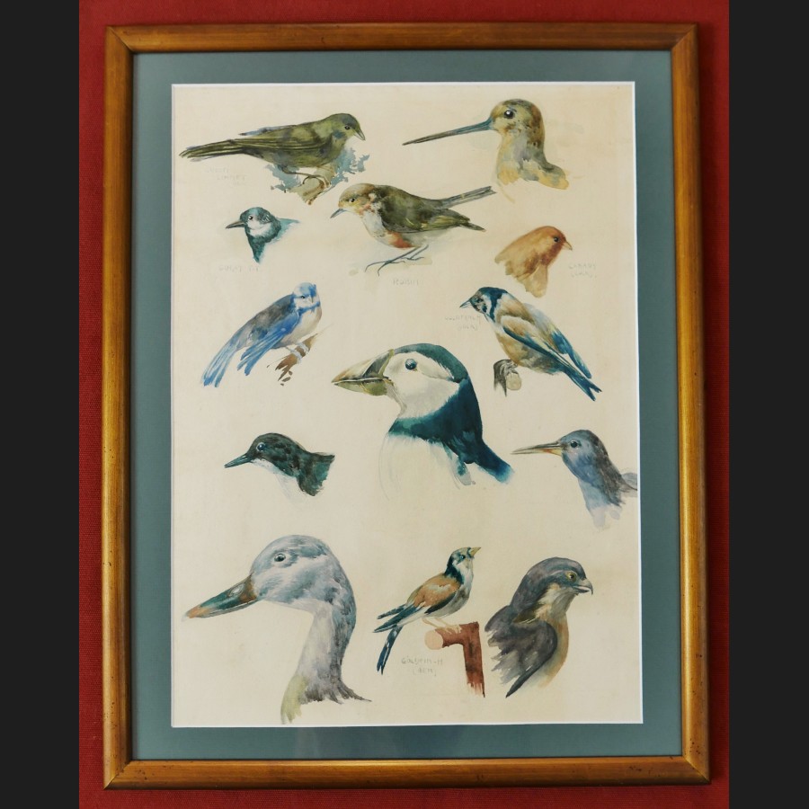 École ANGLAISE circa 1930Oiseaux d'EuropeAquarelle sur papierSigné au dos E. FINK50 x 36 cmCadre en bois doré