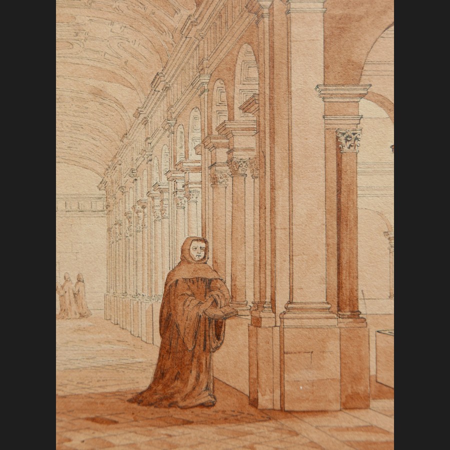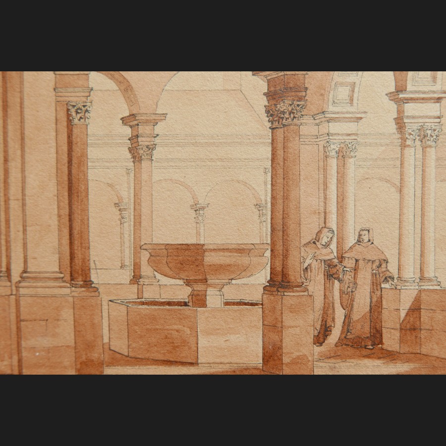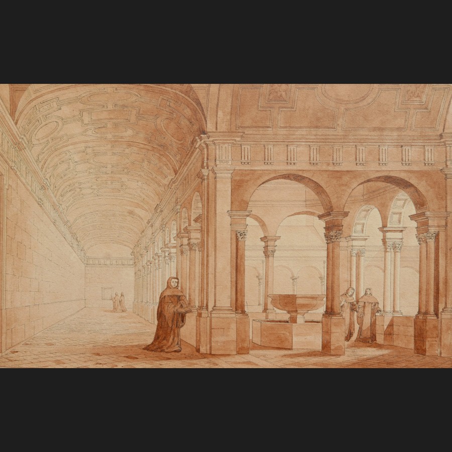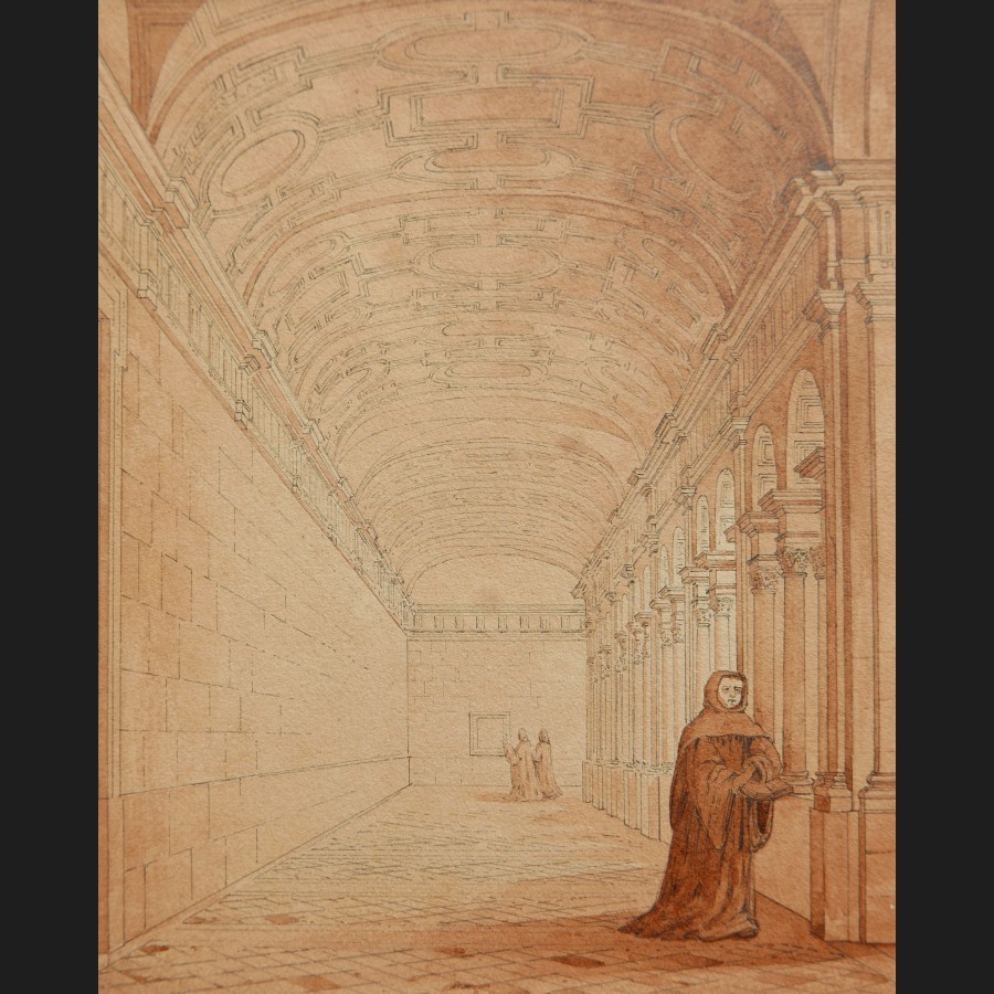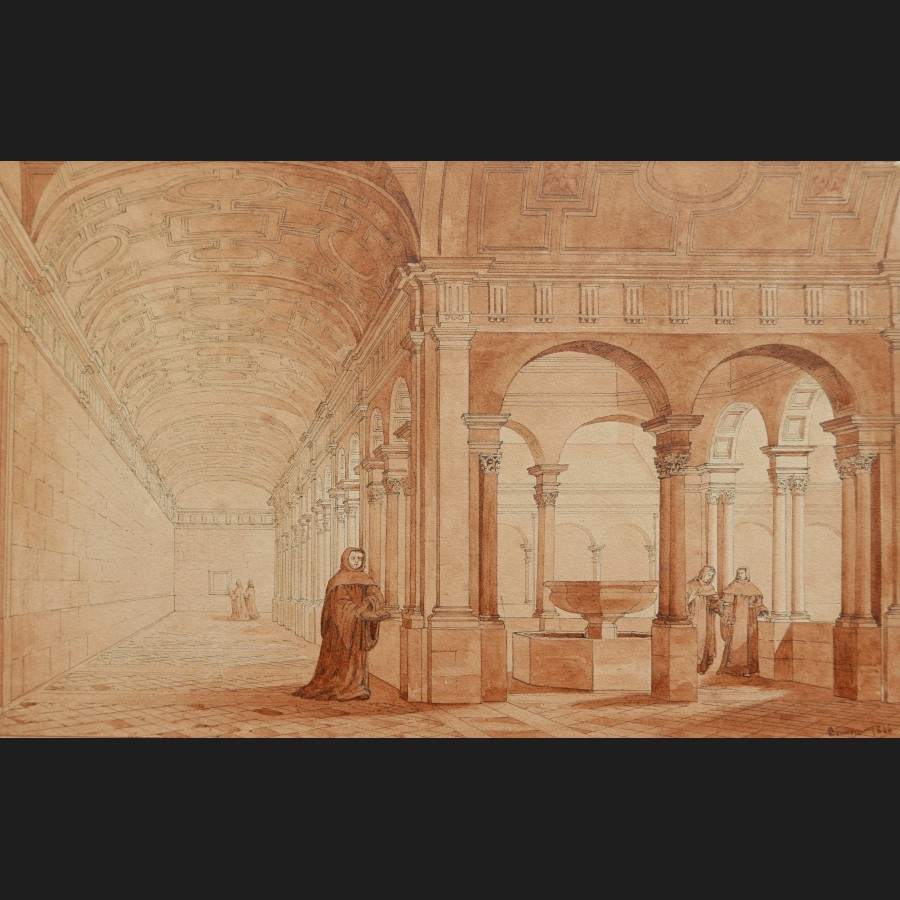 Jean-Édouard BONNORE, Cloître néoclassique animé, dessin