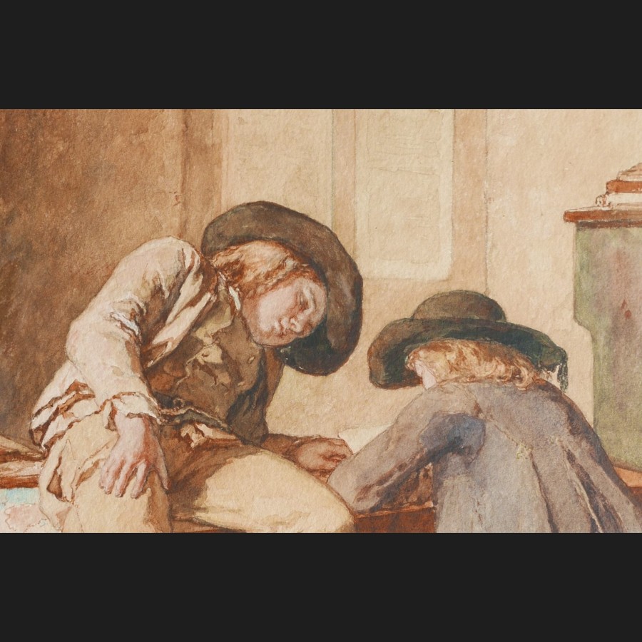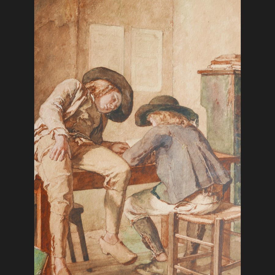 Jean-Baptiste Jules TRAYER, Deux enfants bretons à l'école, aquarelle
