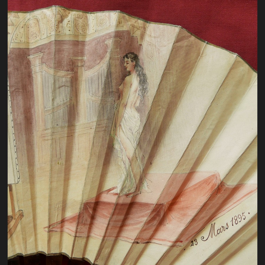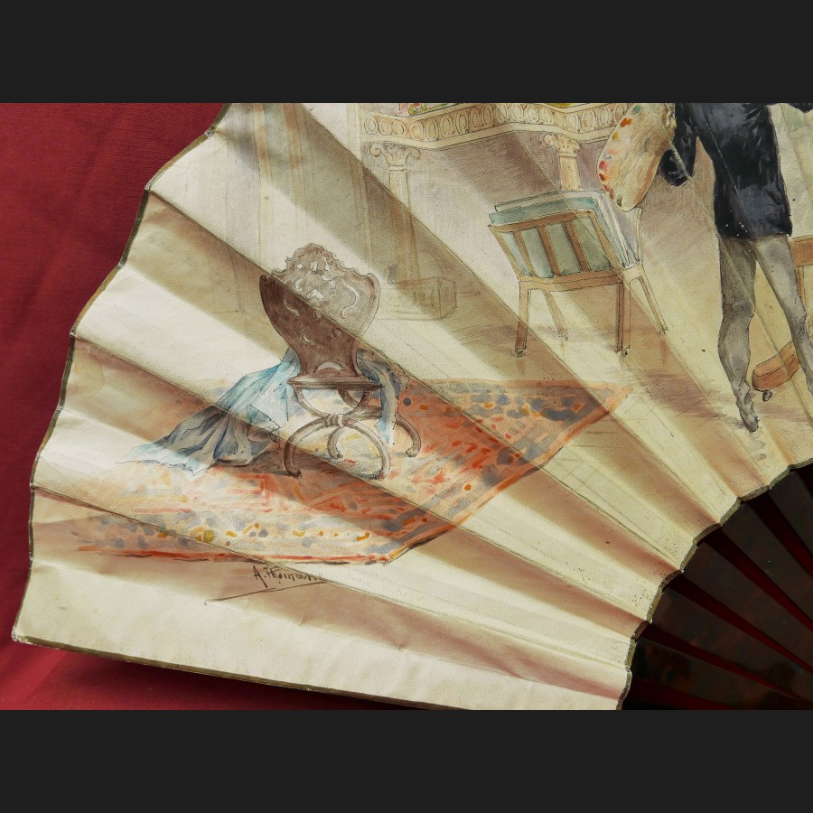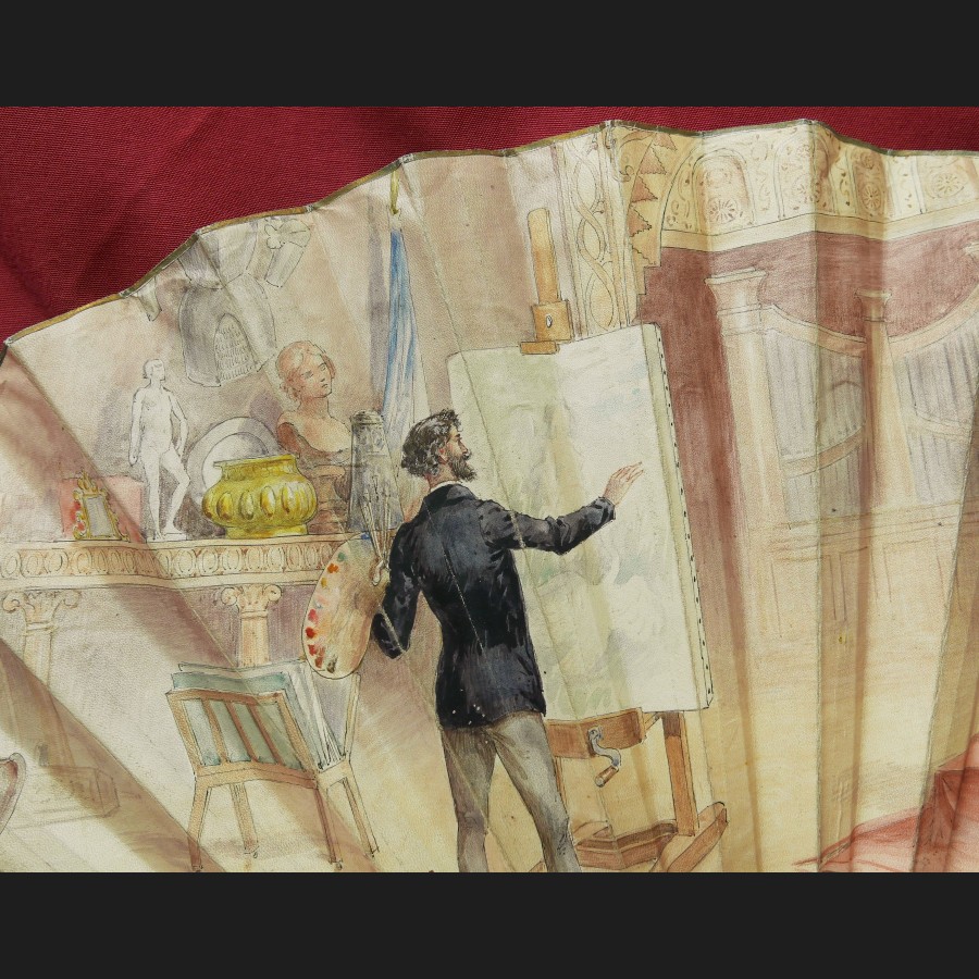 Adolphe THOMASSE pour DUVELLEROY, Le peintre et le modèle dans l'atelier, éventail peint