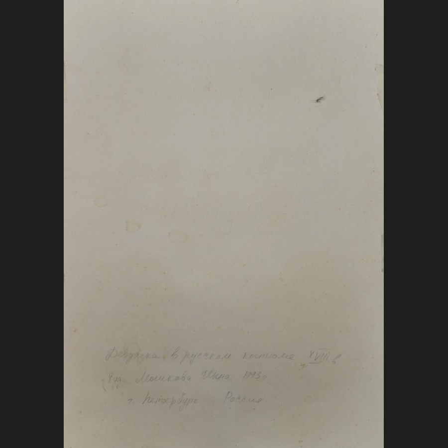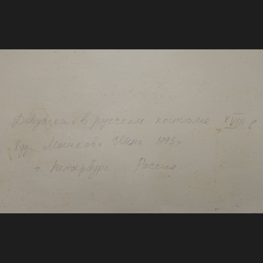 Signé et daté en bas à gauche en cyrillique, Titré, signé, daté et situé au revers en cyrillique Jeune fille en costume traditionnel russe. Peint par Inna Moshkova. 1993. Saint-Pétersbourg. Russie.