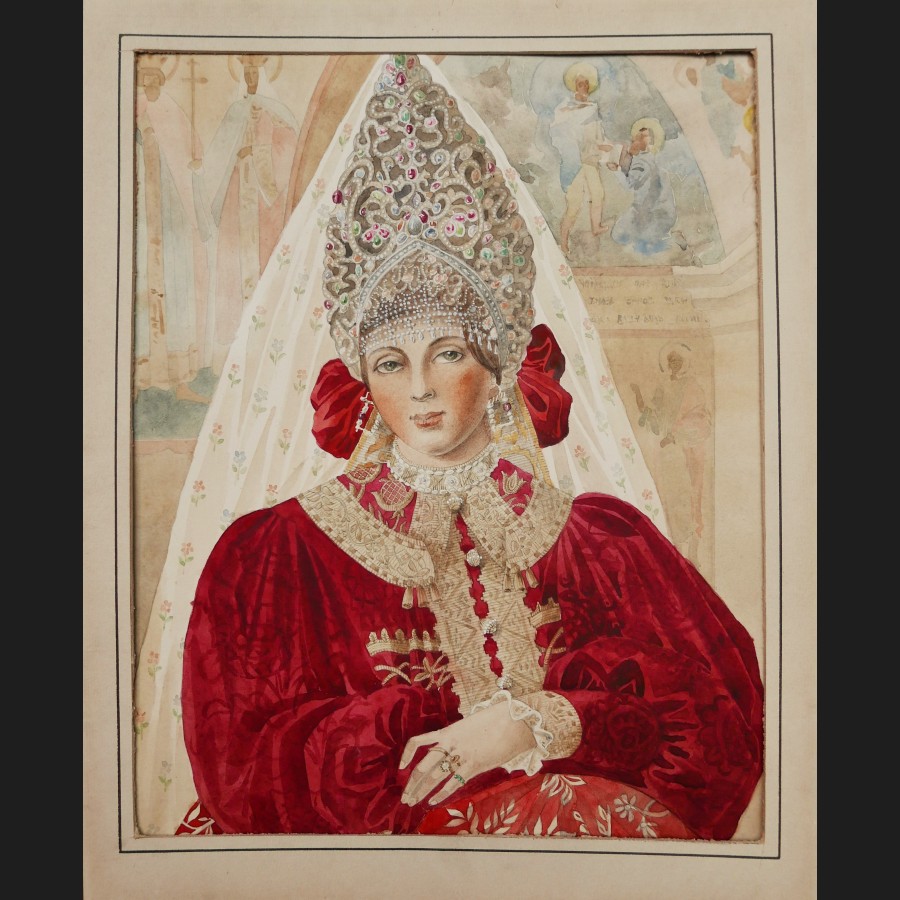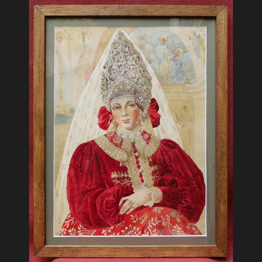 Inna MOSHKOVA, Jeune femme en costume traditionnel russe, aquarelle