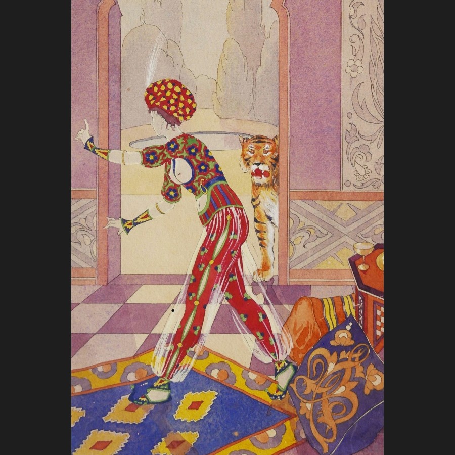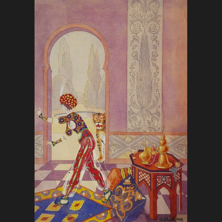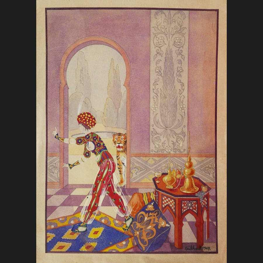 Après son apprentissage, entre 1903 et 1907, à l'École des Beaux-Arts de Bordeaux auprès de Paul François Quinsac, le jeune René Buthaud intègre l'École des Beaux-Arts de Paris en 1909, où il restera jusqu'en 1913. Il s'agit donc d'une oeuvre de jeunesse, assez différente du style qui va devenir le sien par la suite, mais déjà caractérisée par une certaine élégance décorative et une iconographie annonciatrices de l'Art Déco.