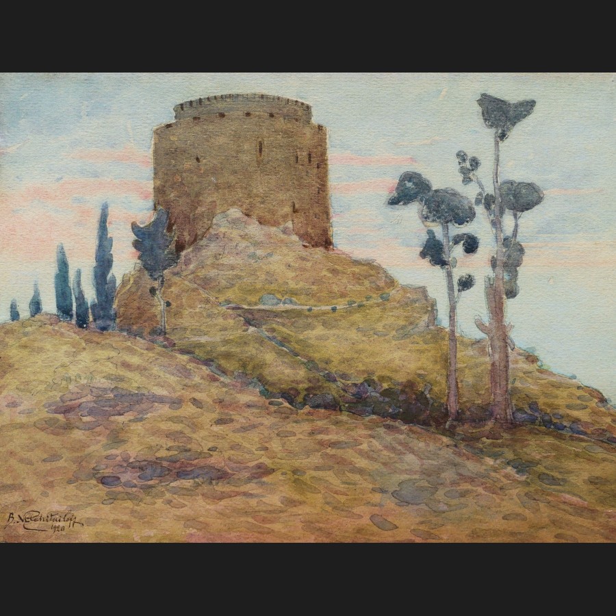Basile Nicolaevitch NETCHITAILOFF, Vue d'une tour en Italie ou dans le Midi en bord de mer, aquarelle
