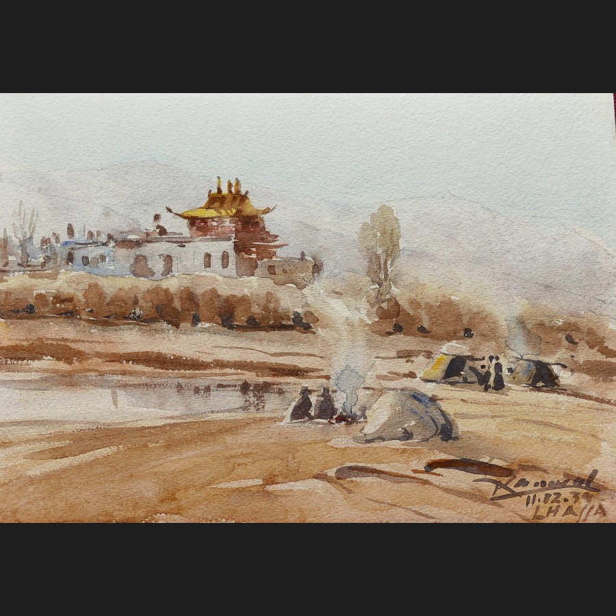 Krishna KANWAL, Vue d'un monastère à Lhassa au Tibet, aquarelle