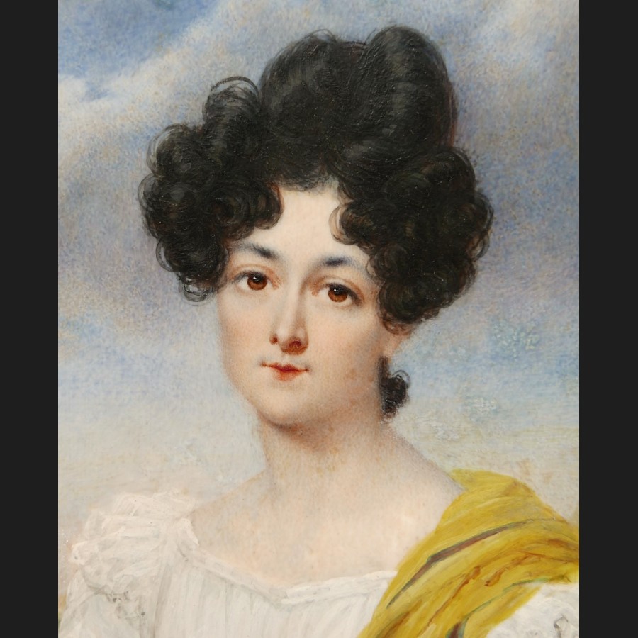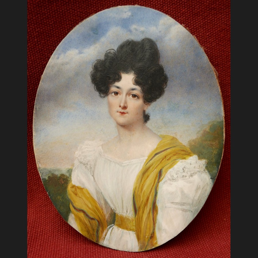 École FRANÇAISE d'époque RESTAURATION, Portrait de femme en robe blanche, miniature