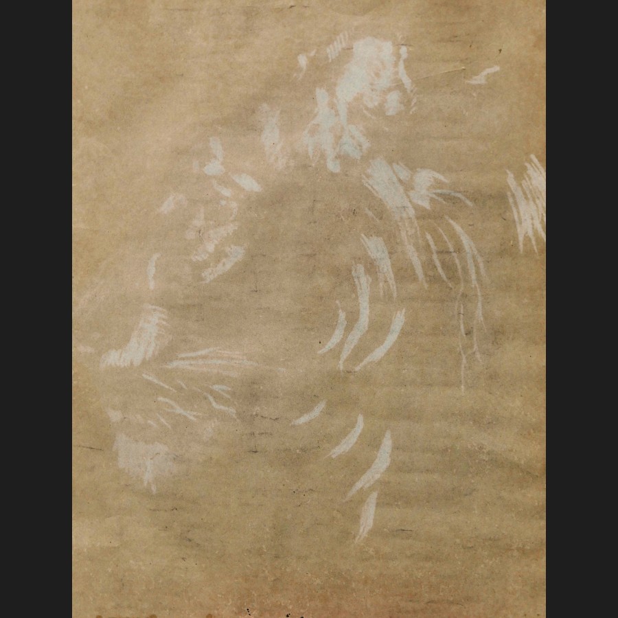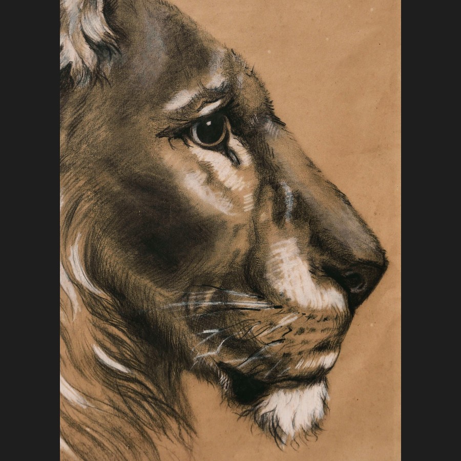 École FRANÇAISE du XIXème siècleTête de lionFusain et rehauts de craie blanche sur papier beigeMonogrammé JL ou JC en bas à gauche62 x 49 cm