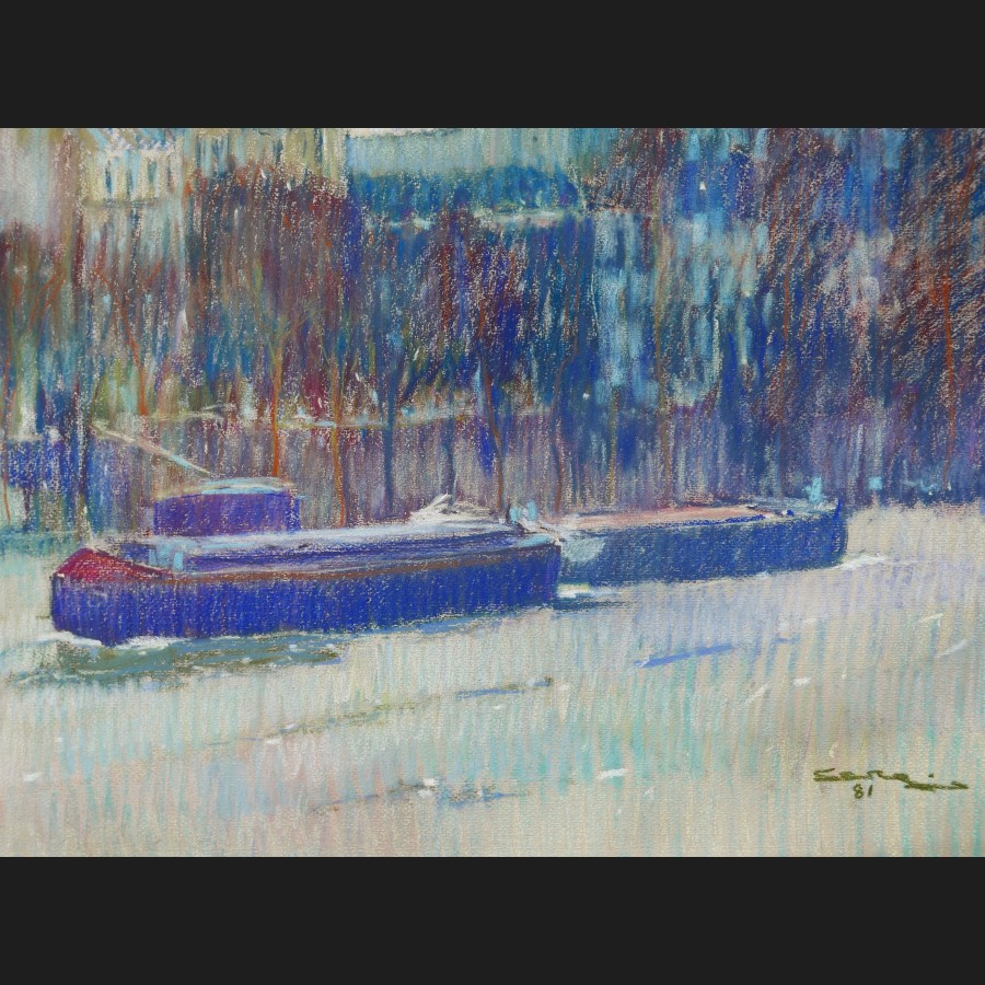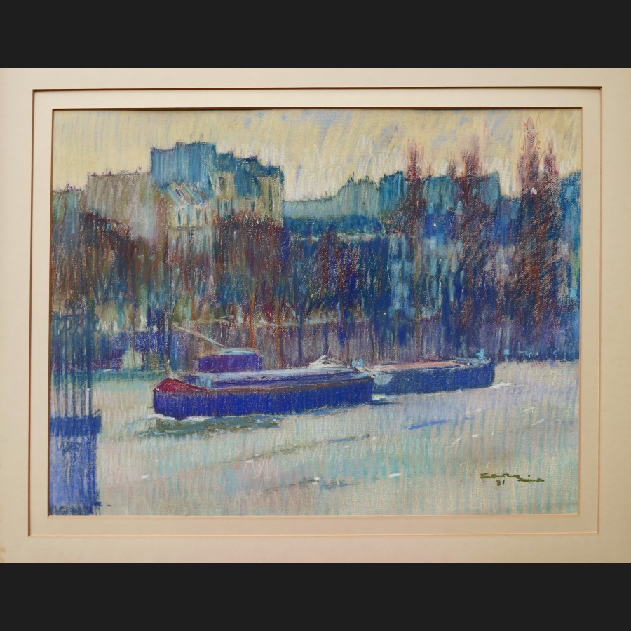 Signé et daté en bas à droite Sera (?) 81, titré et contresigné au dos El Sena, barcasses” / Sera (?) 81