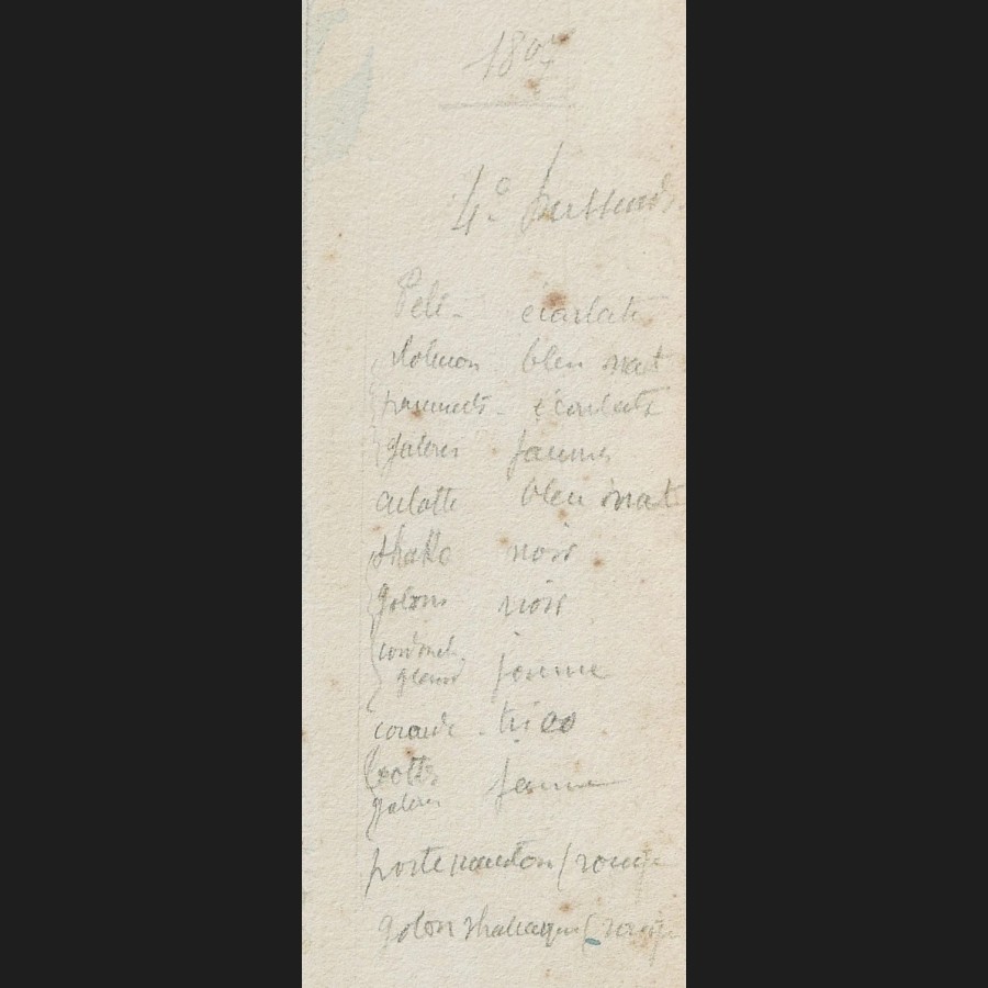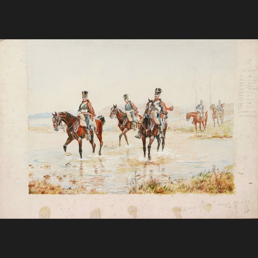 Signé Eva Ressan en bas à droite, daté et annoté sur la droite 1807 / 4° hussards, suivi des codes couleur des uniformes