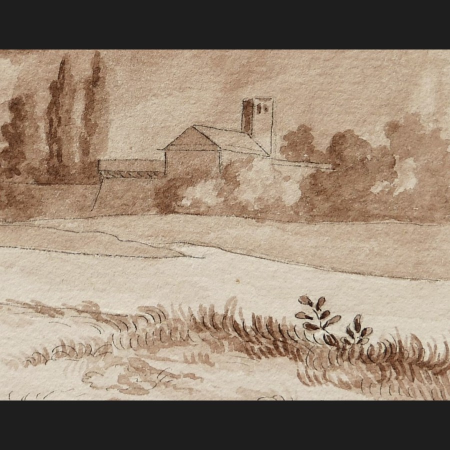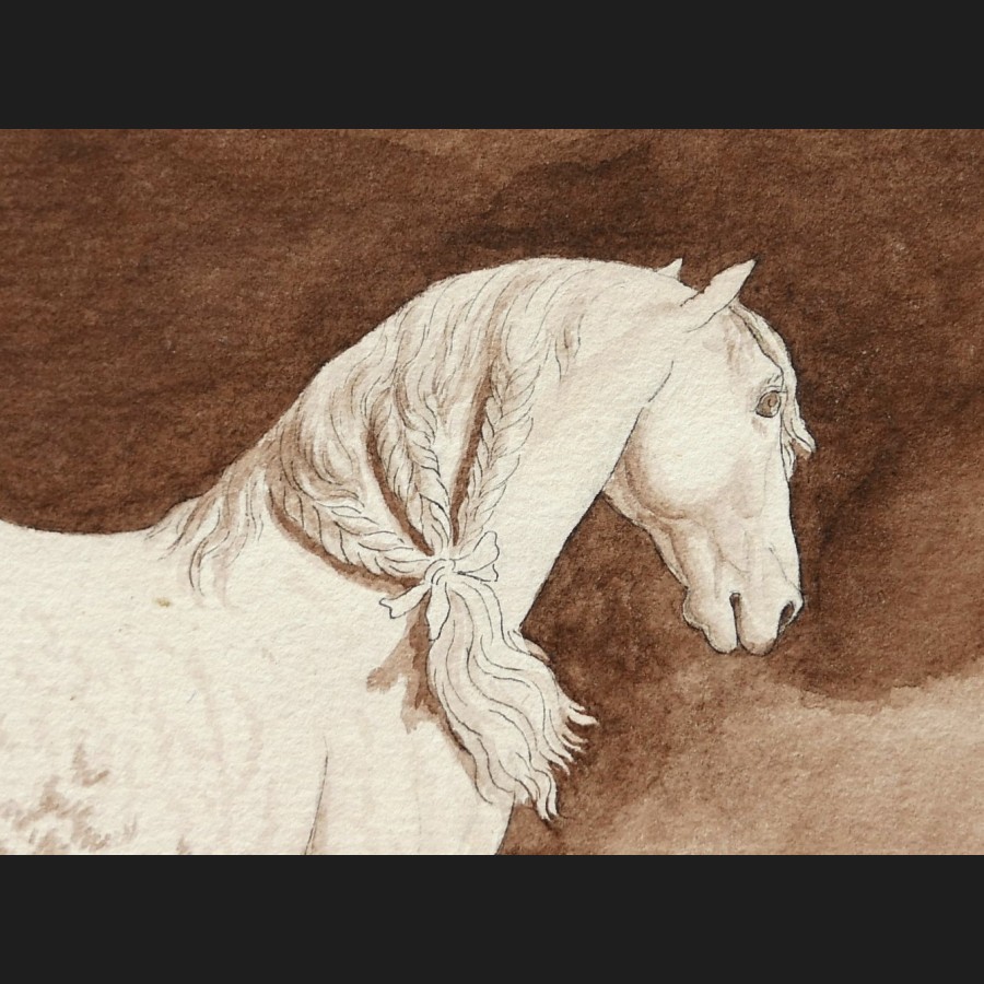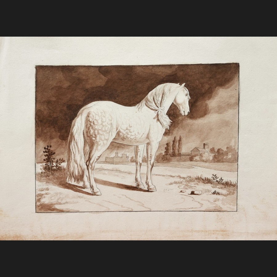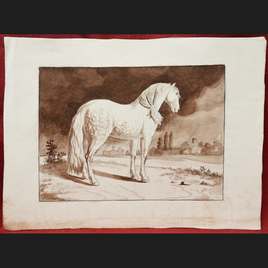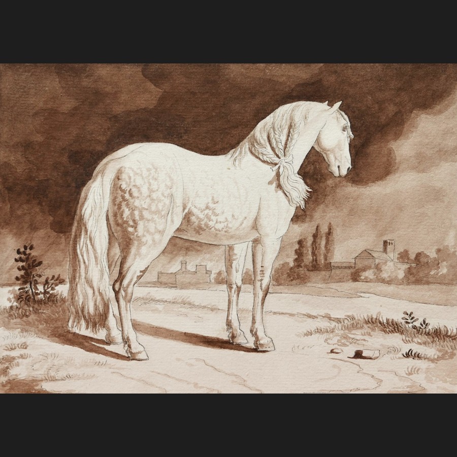 École FRANÇAISE circa 1820, Cheval pommelé dans un paysage italien, lavis