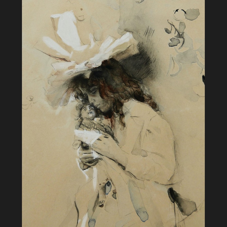 Serafino MACCHIATI, Jeune fille tenant une poupée, dessin