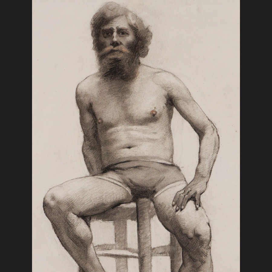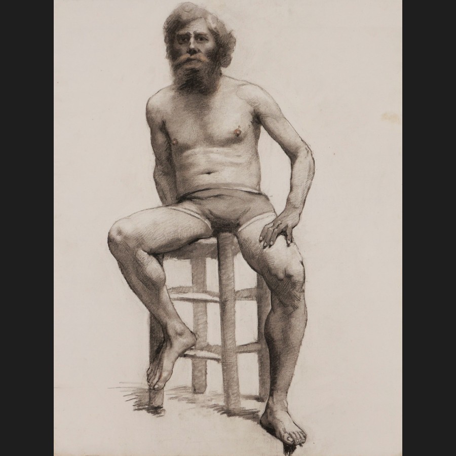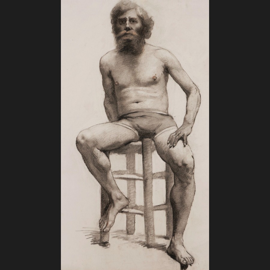 Laetitia DOUMICHAUD de la CHASSAGNE-GROSSE, Académie d'homme barbu assis sur un tabouret, dessin
