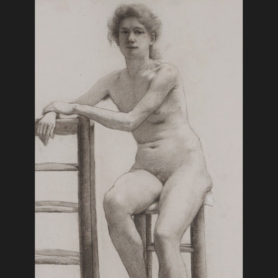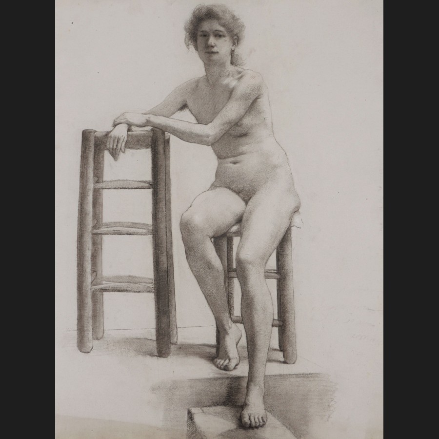 Académie de femme nue assise sur un tabouret, les mains posées sur un autre tabouret