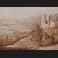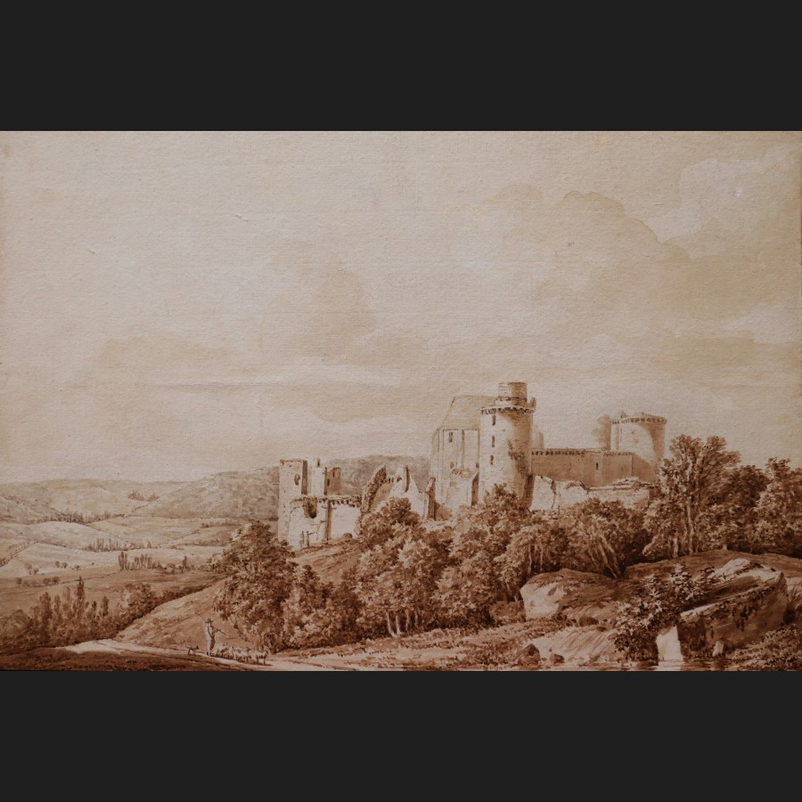 École FRANÇAISE circa 1820, Berger, troupeau et promeneurs devant un château-fort en ruines, dessin