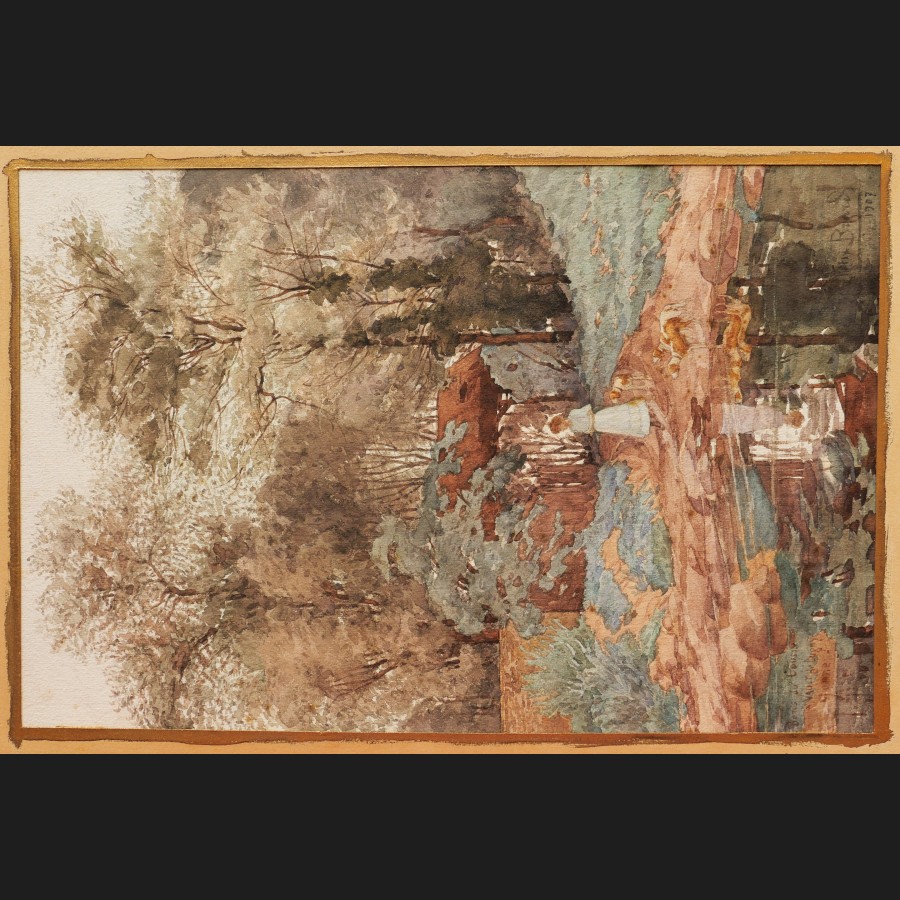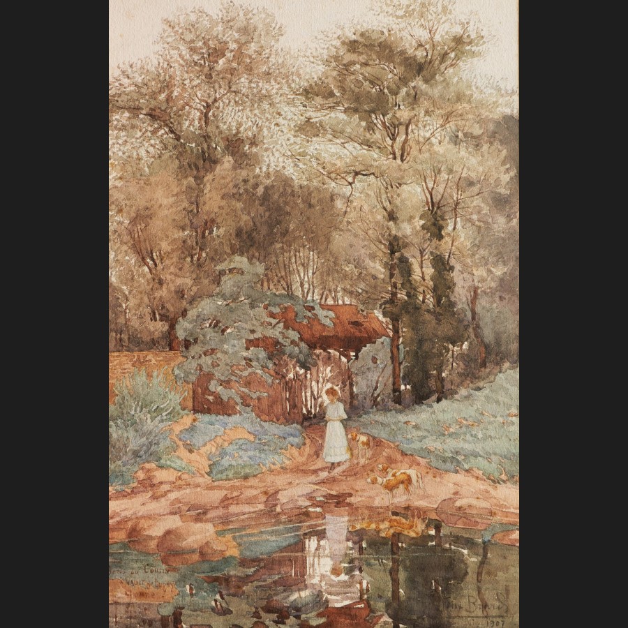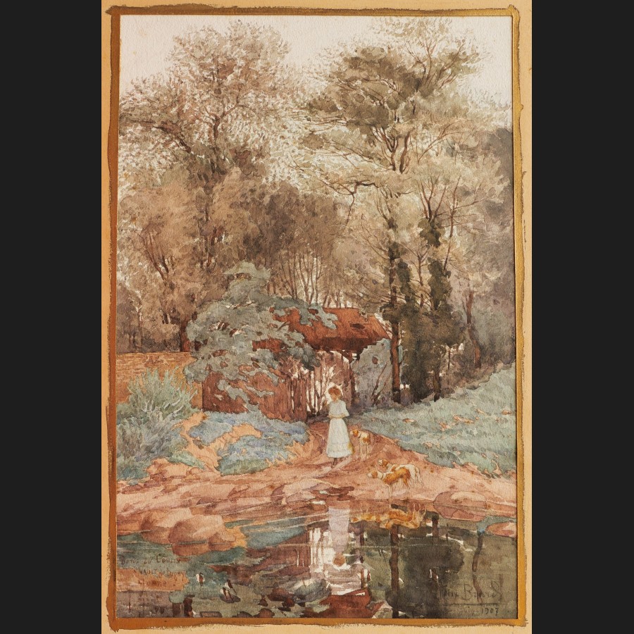 Félix BRARD, Femme avec ses deux chiens au bord du Cousin dans l'Yonne, aquarelle