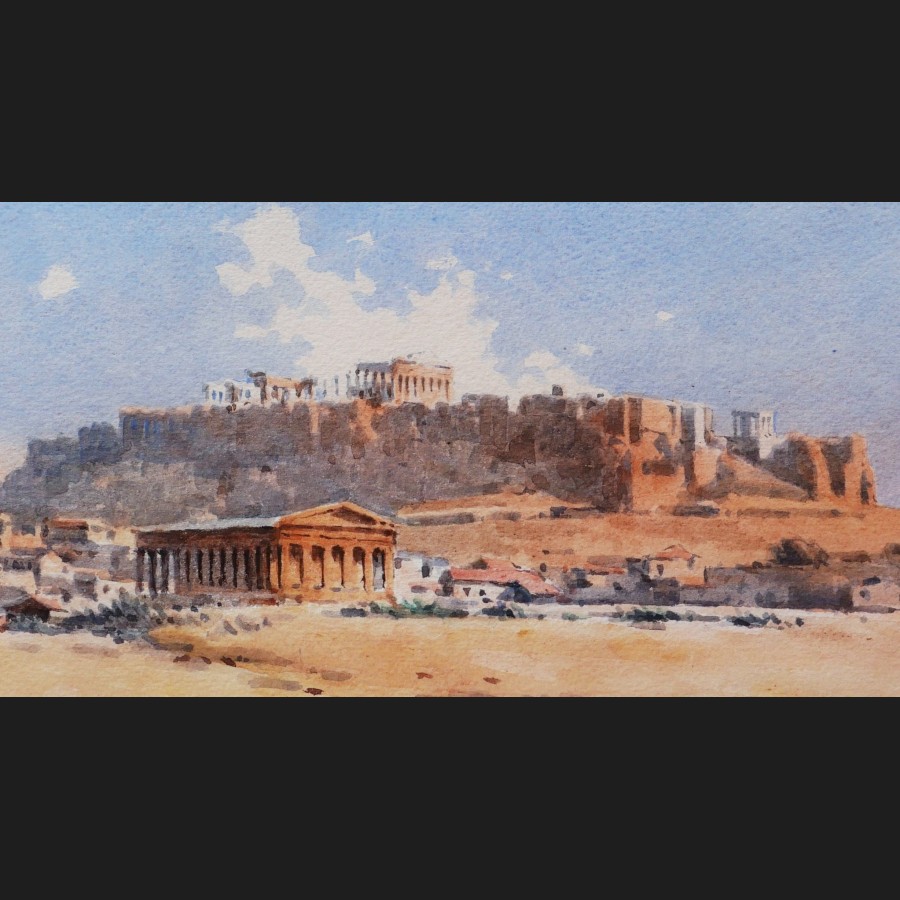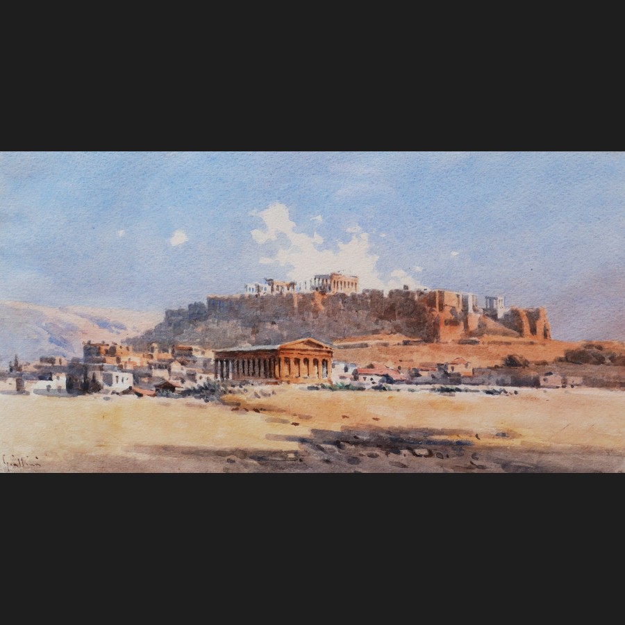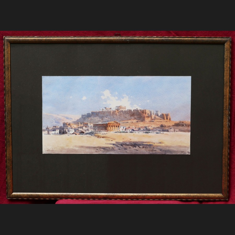 Angelos GIALLINA (Corfu, 1857 – Corfu, 1939)Vue de l'AcropoleAquarelle sur papierSigné en bas à gauche Giallina16,5 x 32 cmCadre en bois doré