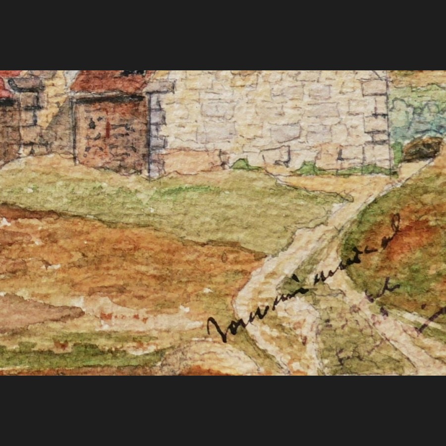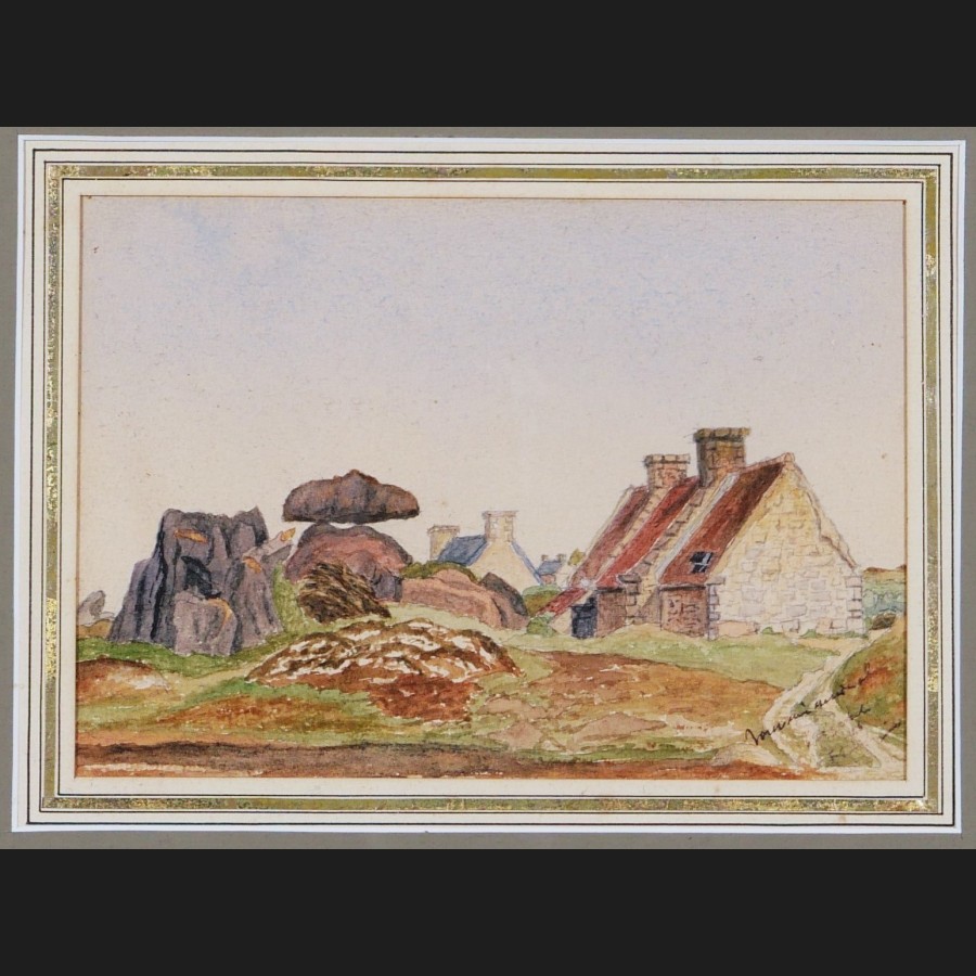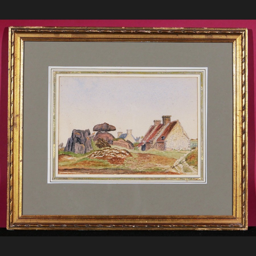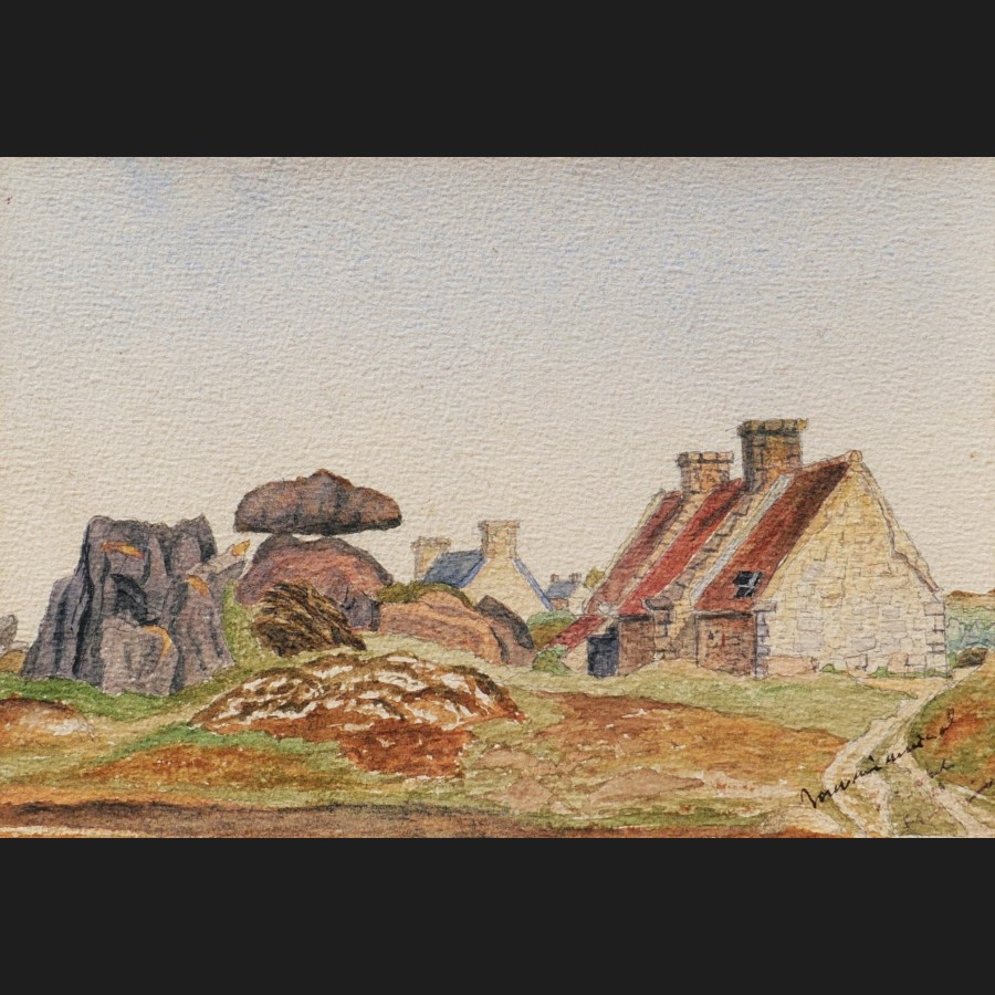 École FRANÇAISE circa 1920, Chaumières bretonnes et blocs de granit à Trégastel, aquarelle