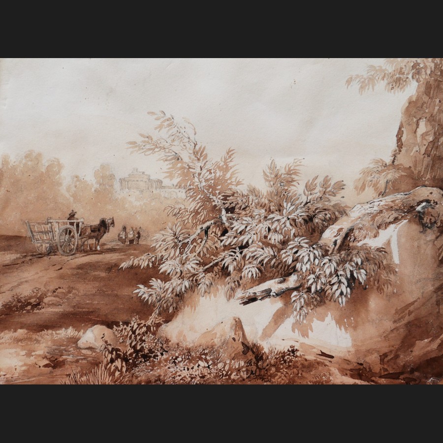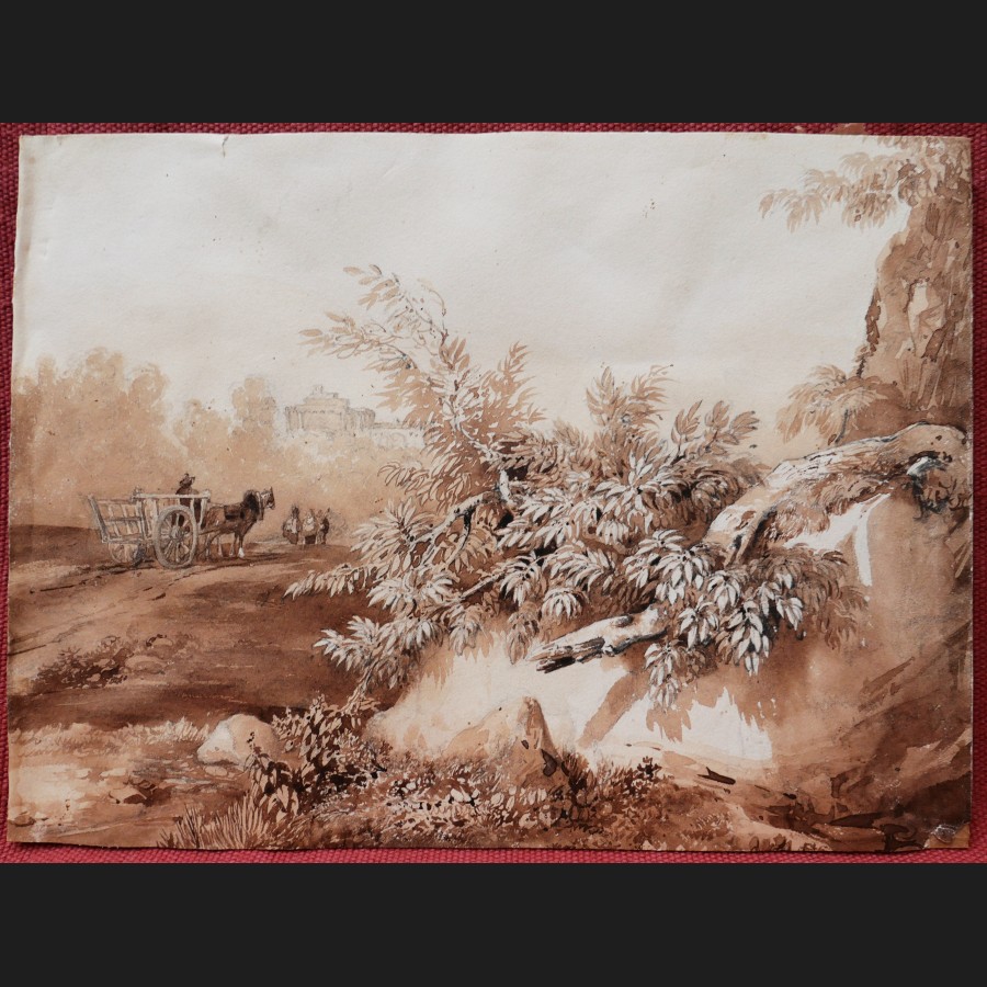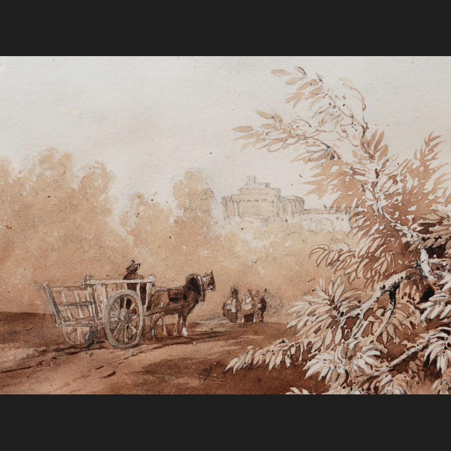 École FRANÇAISE, début XIXème siècle, Carriole et paysans dans la campagne italienne, lavis
