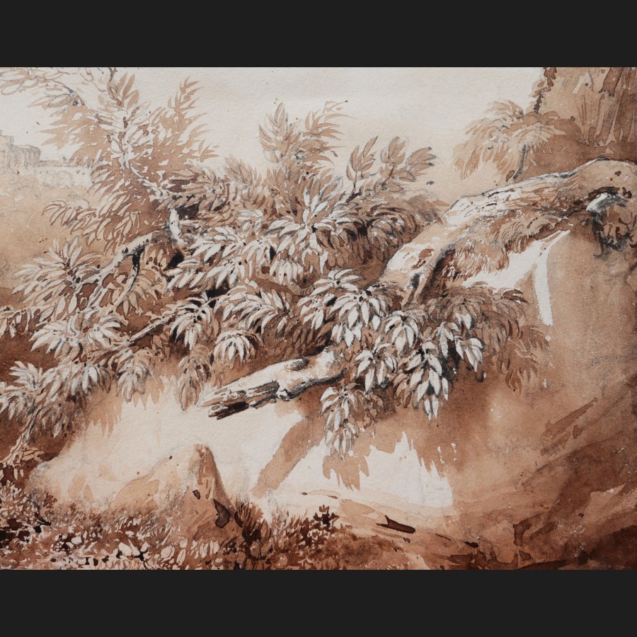 Fusain, pinceau, encre bistre et lavis d'encre bistre