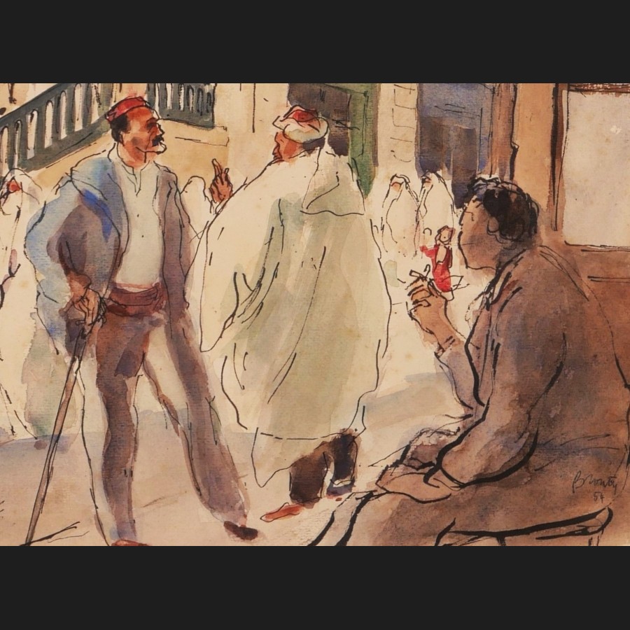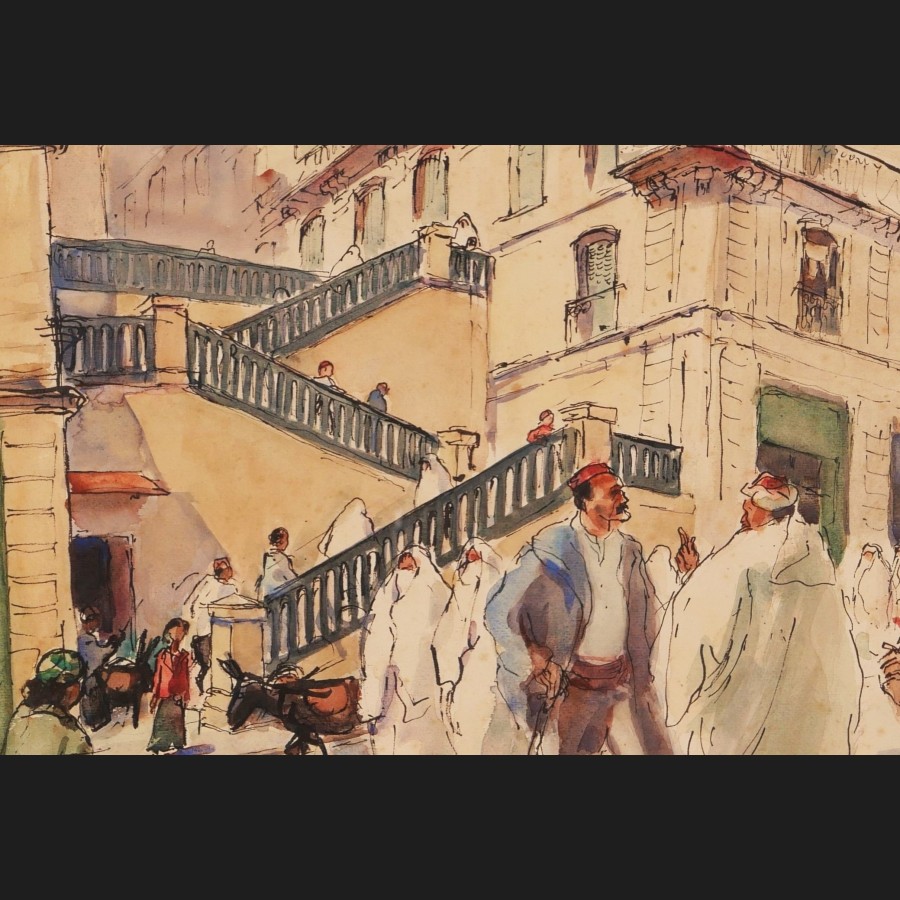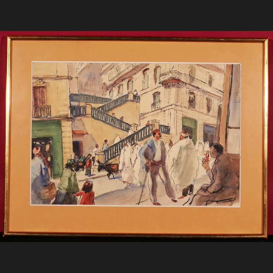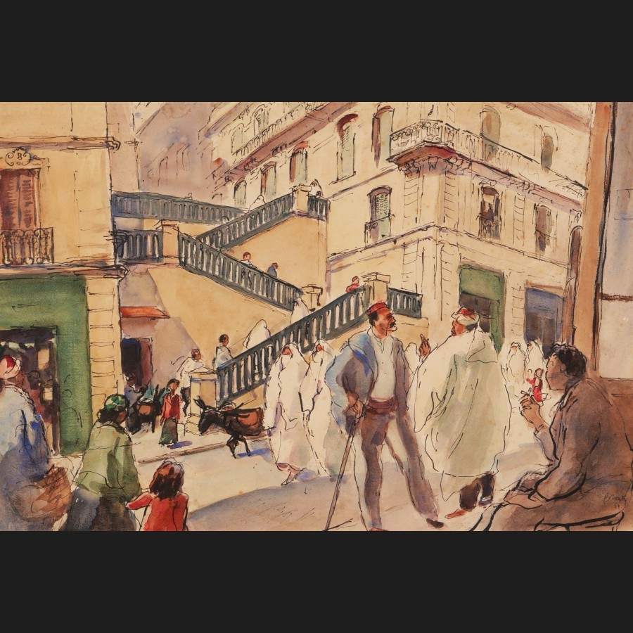 Charles BROUTY, Vue animée dans la Casbah d'Alger, aquarelle