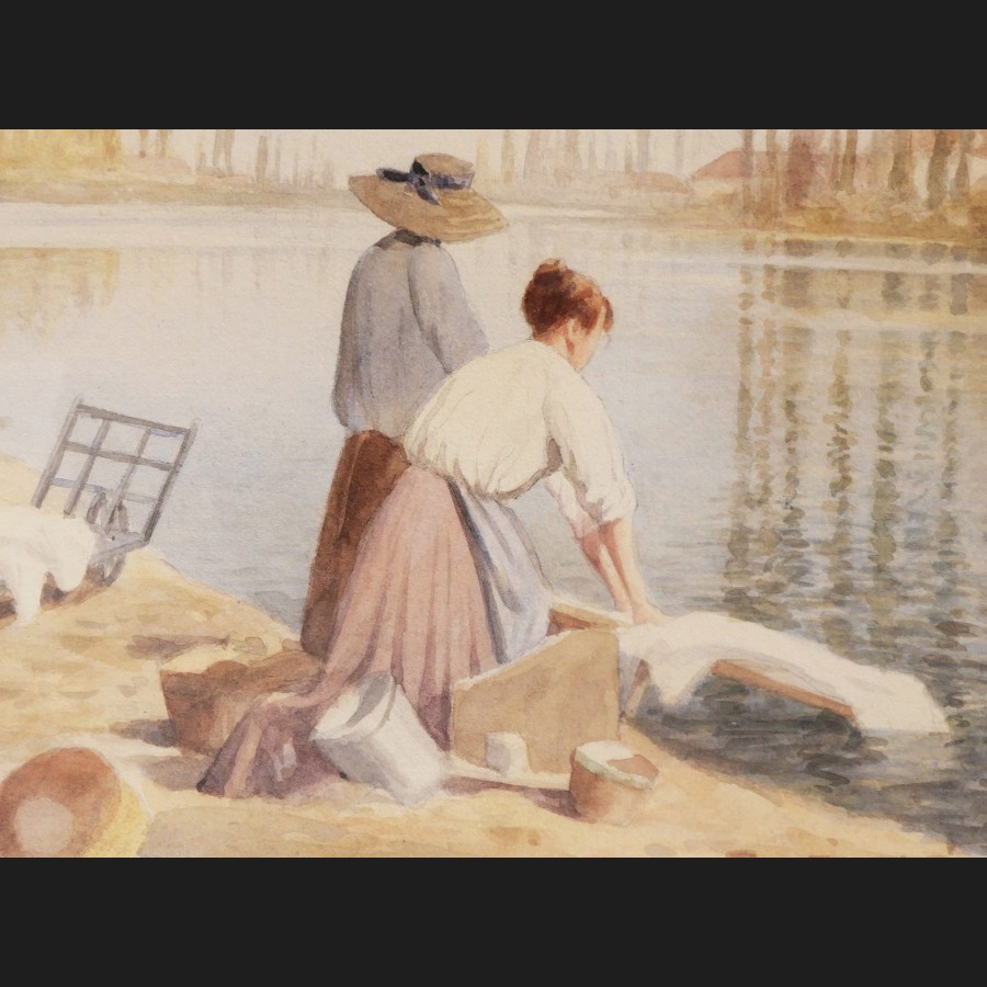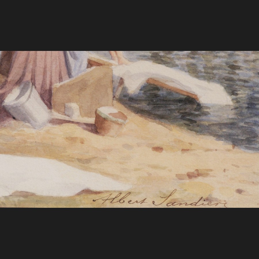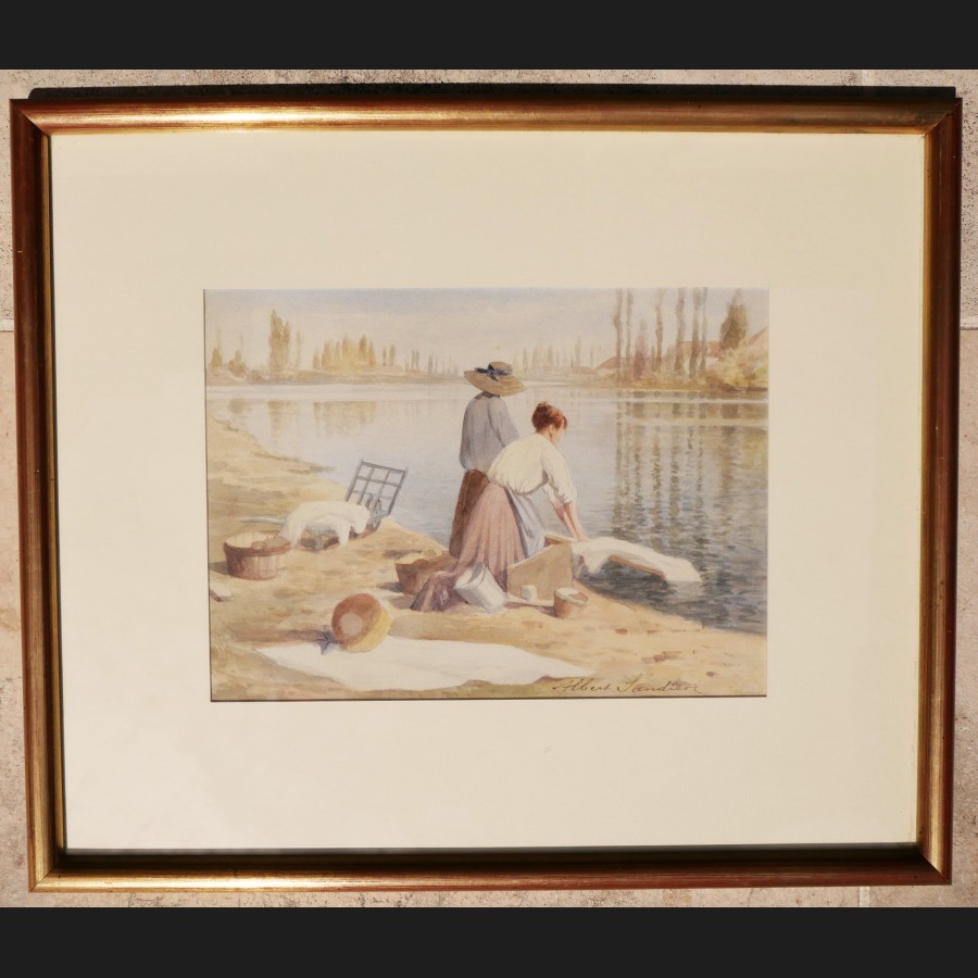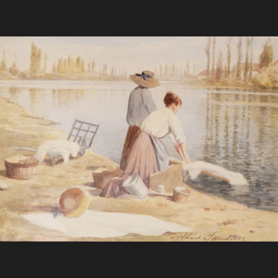 Albert SANDIER (Beaune, 1890 – Dijon, 1918)Lavandières Aquarelle sur papierSigné en bas à droite Albert Sandier17 x 23 cmCadre en bois doré