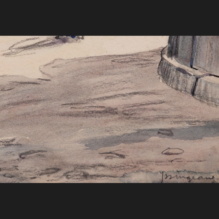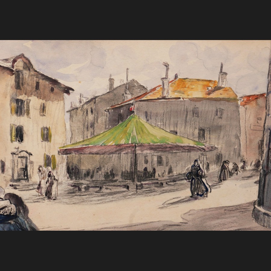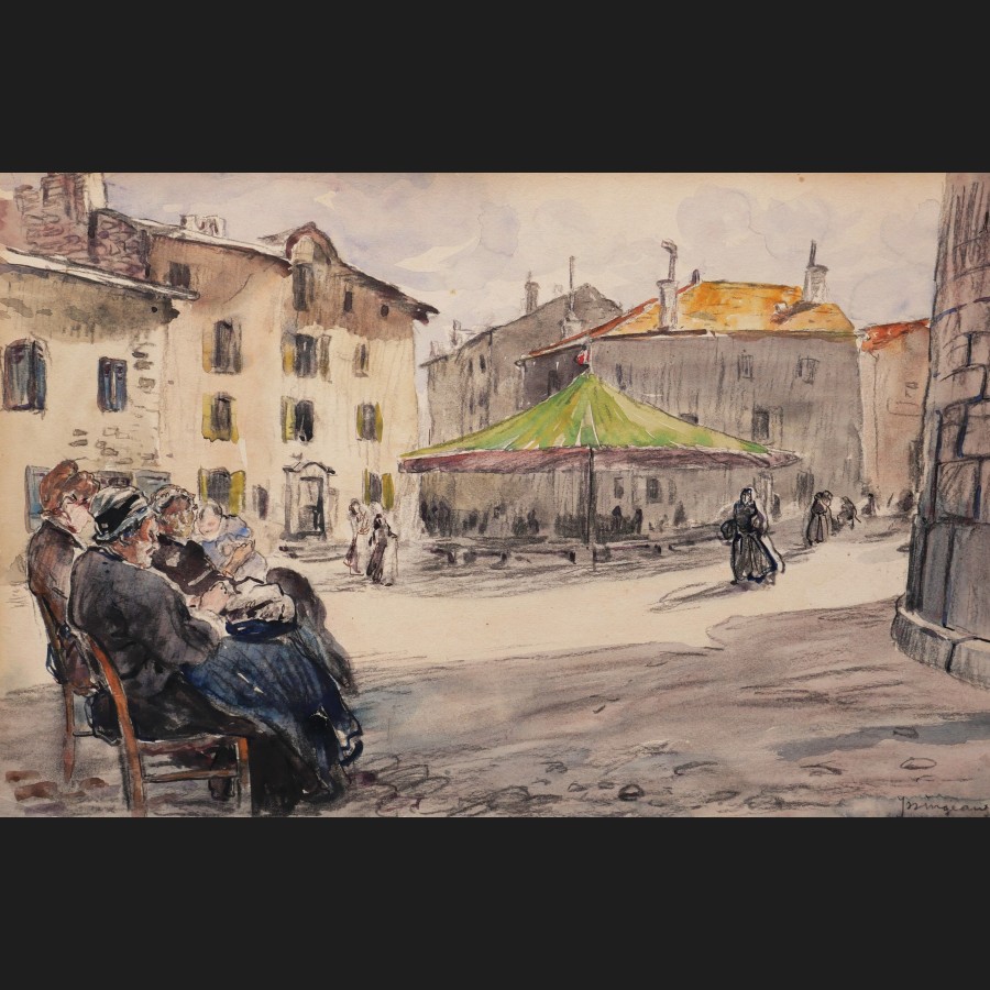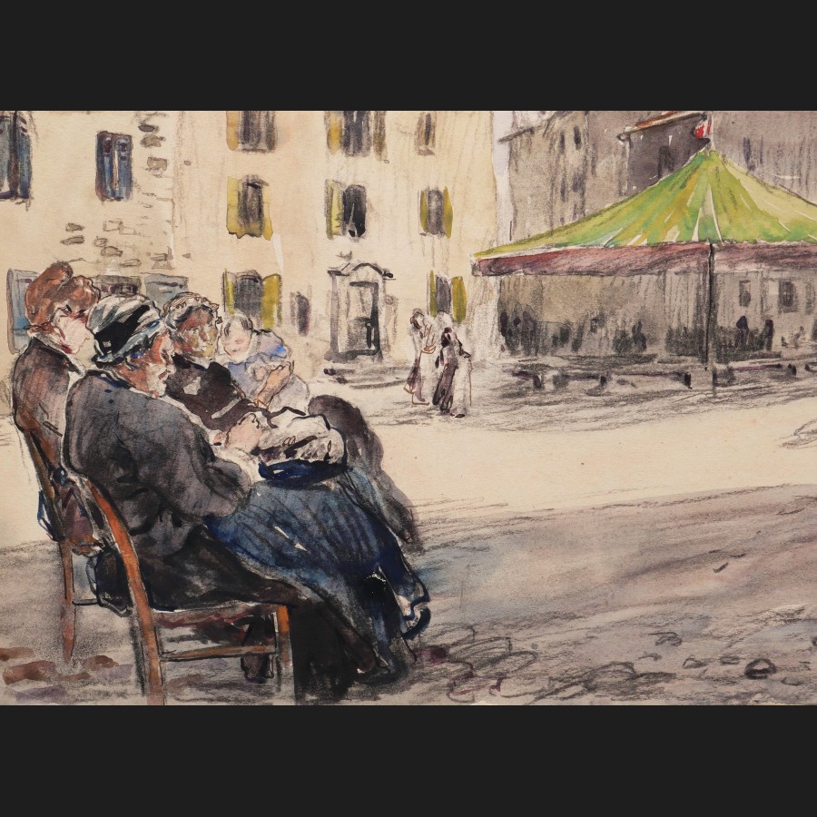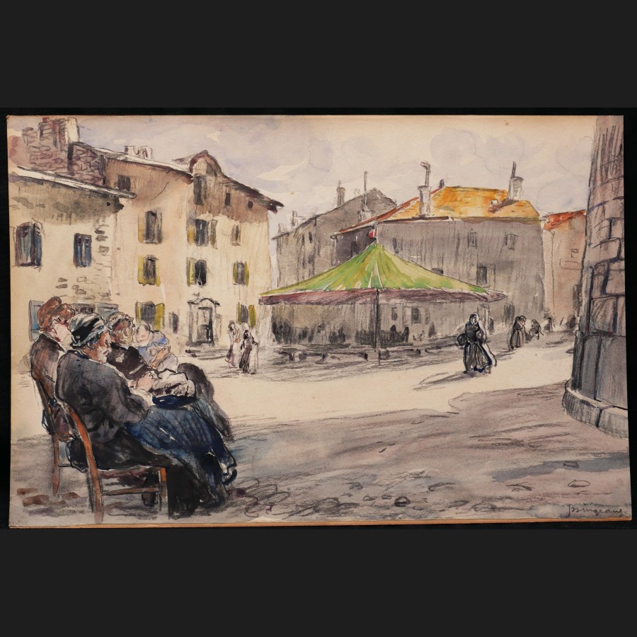 Eugène VILLON, Dentellières sur la place à Yssingeaux, aquarelle
